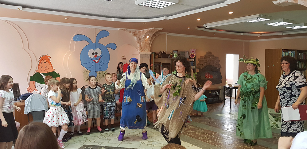 После спектакля под волшебную музыку в зал вышла Сказочница и предложила детям вместе построить Музей сказок. Но для того, чтобы его построить, необходимо было преодолеть препятствия: сказочные герои в исполнении сотрудников библиотеки и юных читателей – Пакости, Кот в сапогах, Леший, Водяной, Баба Яга, Золушка, и Буратино – придумали для детей конкурсы, загадки, викторины, игры.