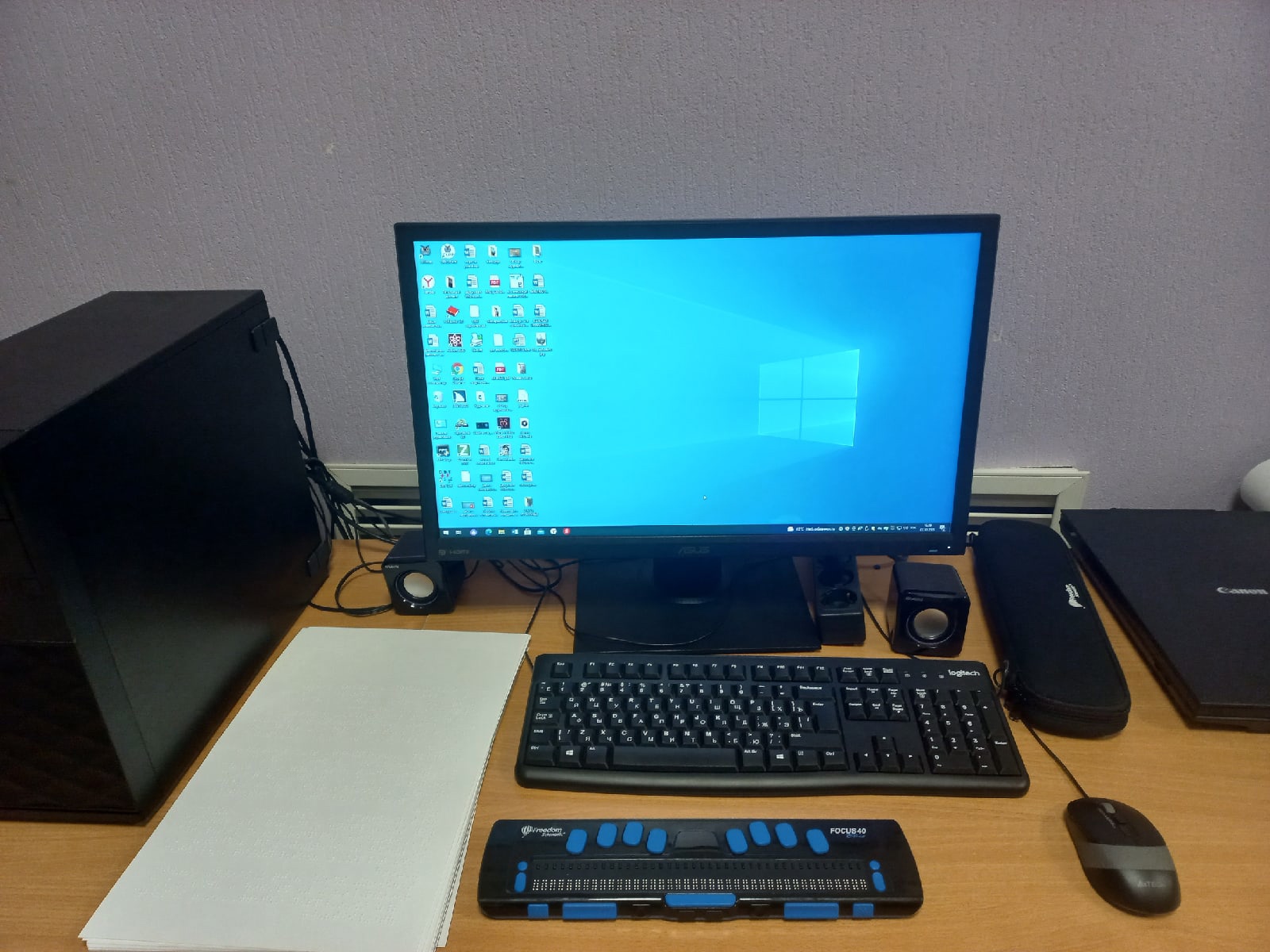 В читальном зале неподдельный интерес вызвало специальное стационарное рабочее место для незрячего или слабовидящего пользователя, которое обеспечивает возможность работы со звуковой, графической, текстовой и печатной информацией при помощи персонального компьютера с установленным набором специализированного программного обеспечения.