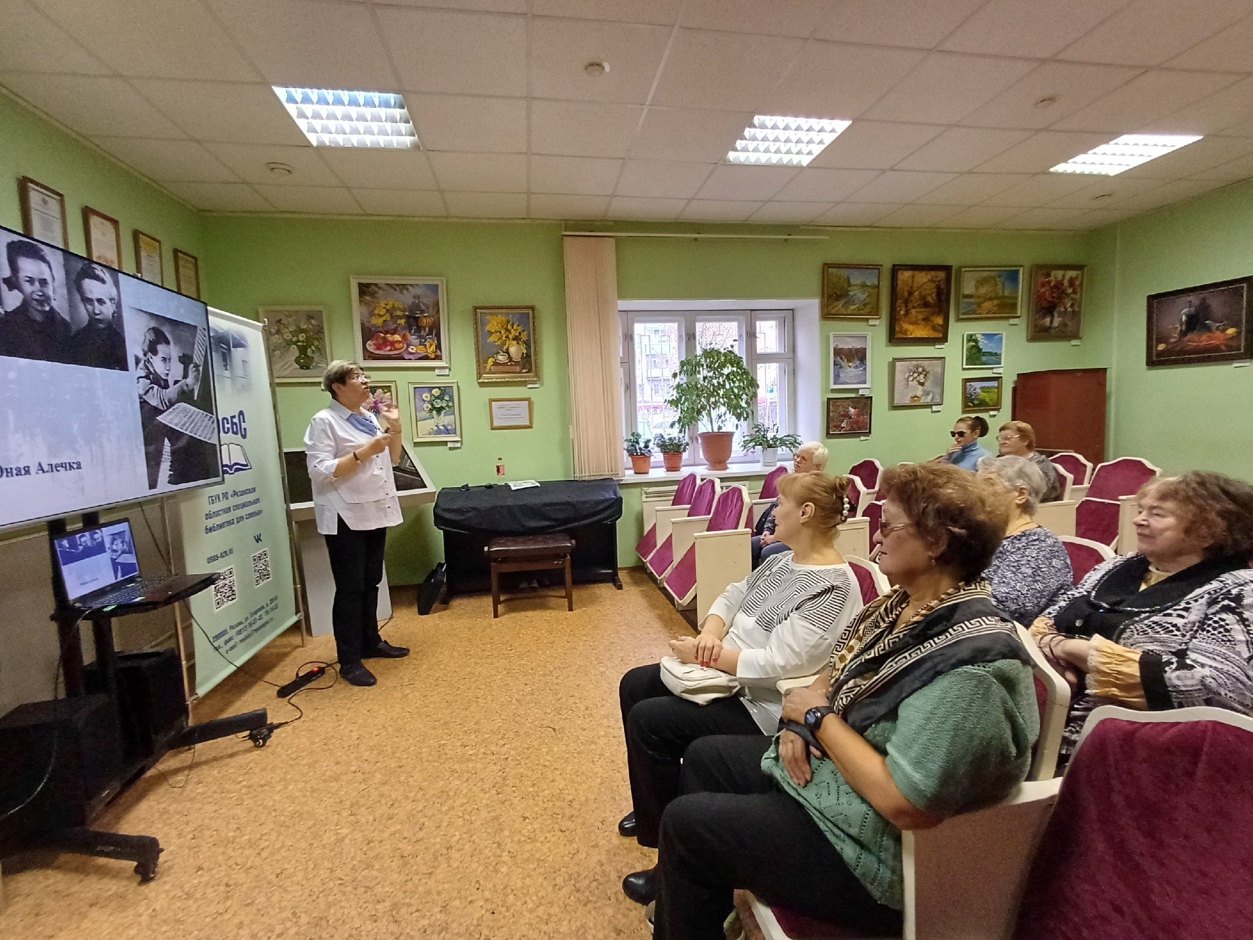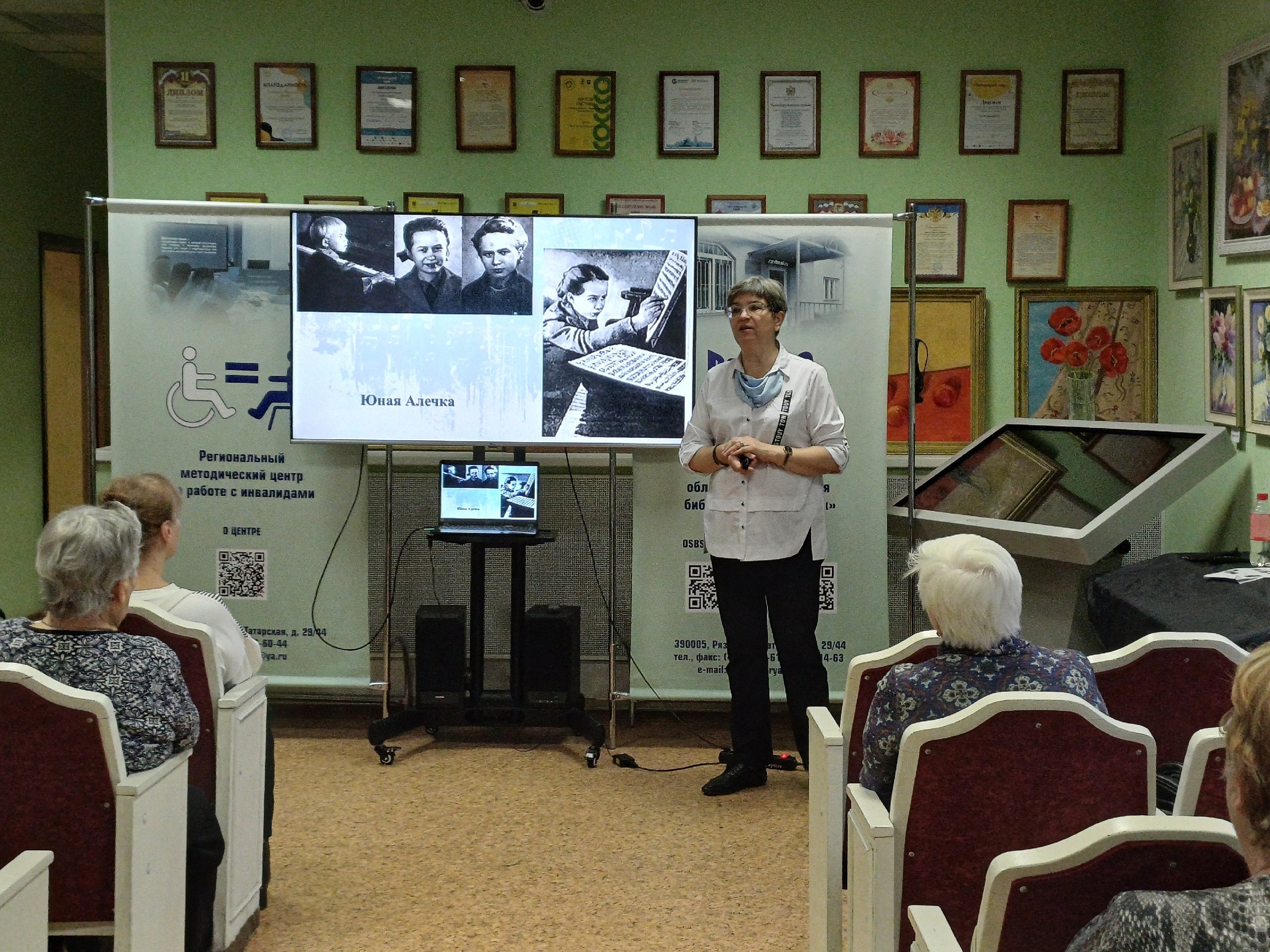 Главный библиотекарь Регионального методического центра по работе с инвалидами Смирнова О.А. рассказала о детстве и юности талантливой Алечки, её первых песенных работах, композиторском развитии и совершенствовании.