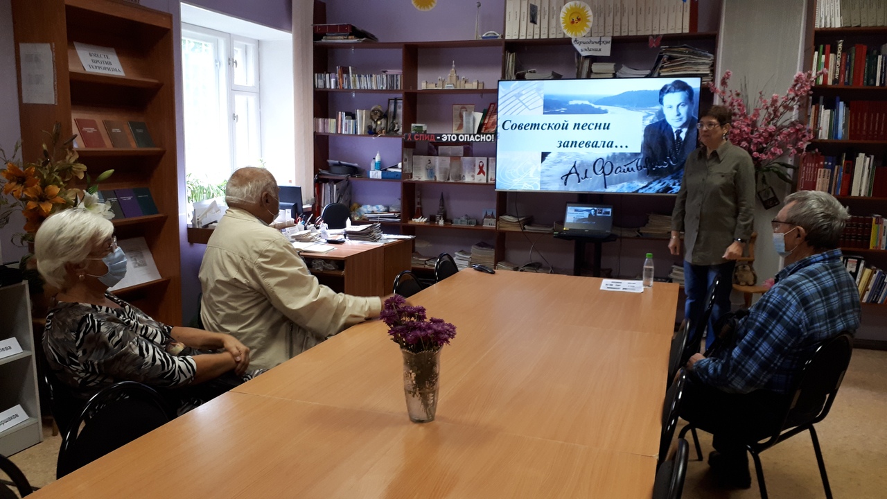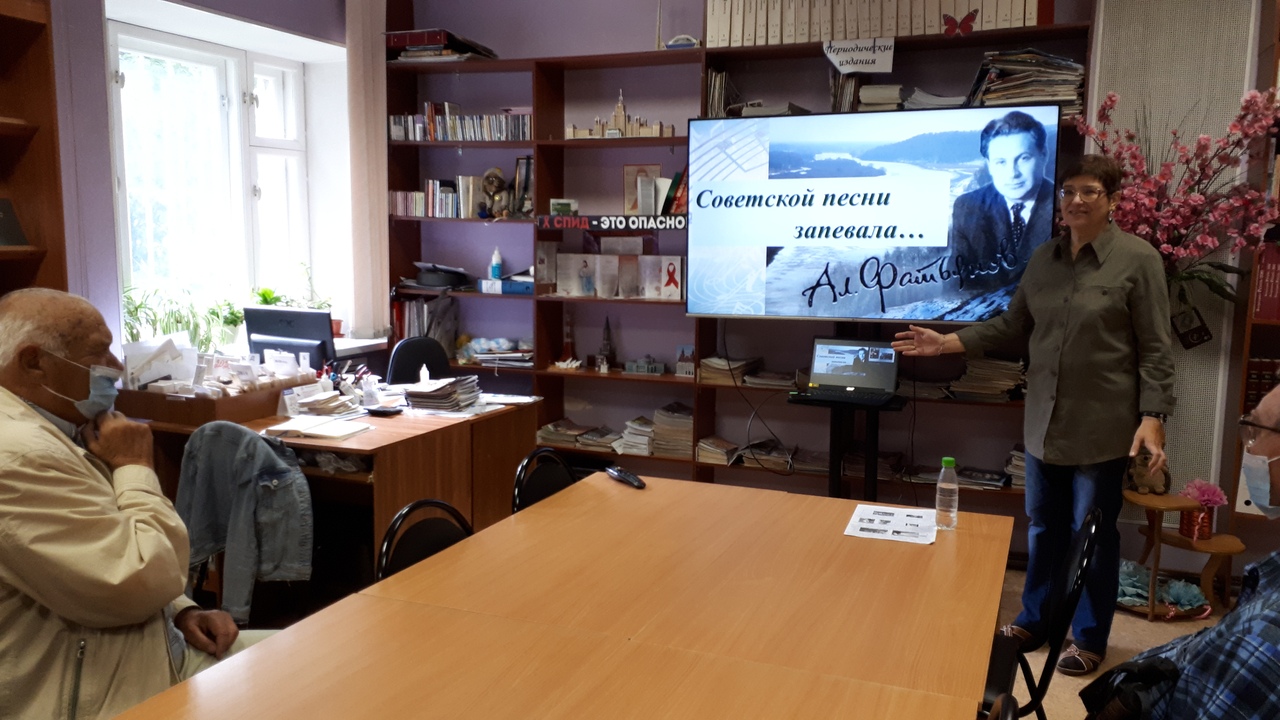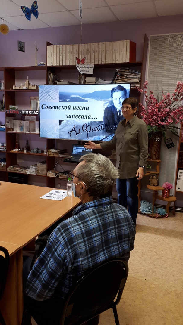 Главный библиотекарь О.А. Смирнова рассказала читателям библиотеки о семье Алексея Ивановича, его становлении как поэта, дружбе с В.П. Соловьёвым-Седым, личной жизни, истории создания некоторых известных стихотворений. Прозвучали любимые песни военных лет и песни из кинофильмов на слова А. Фатьянова.