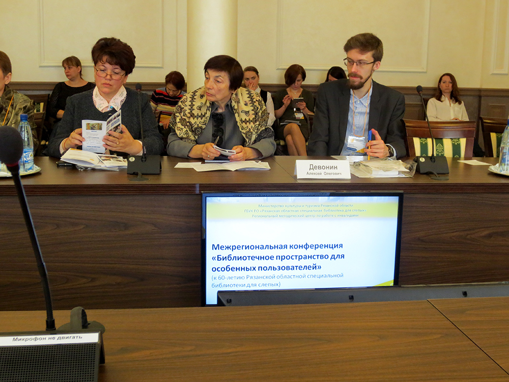 17 апреля 2018 г. в Доме общественных организаций в рамках празднования 60-летия Рязанской областной специальной библиотеки для слепых состоялась инициированная Региональным методическим центром по работе с инвалидами ГБУК РО «Рязанская областная специальная библиотека для слепых» Межрегиональная конференция «Библиотечное пространство для особенных пользователей». В работе конференции приняли участие специалисты Российской государственной библиотеки для слепых (г. Москва), Государственной библиотеки для слепых и слабовидящих (г. Санкт-Петербург), Владимирской областной специальной библиотеки для слепых, Общедоступной библиотеки (г. Радужный, Владимирская область), Липецкой областной специальной библиотеки для слепых, Башкирской республиканской специальной библиотеки для слепых (г. Уфа), государственных и муниципальных библиотек Рязанской области, Государственного музея-заповедника С.А. Есенина (с. Константиново, Рязанская область), школы-интерната № 26 г. Рязани.