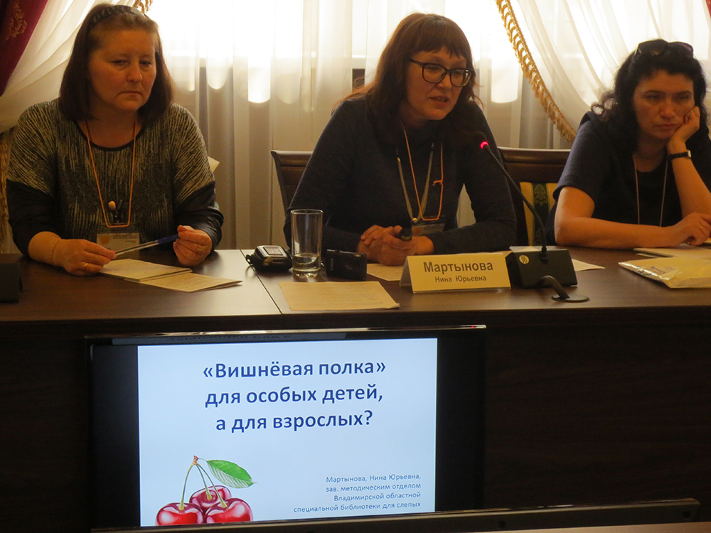 «Вишнёвая полка» для особых детей, а что для взрослых?» - так назвала своё выступление заведующая методическим отделом Владимирской областной специальной библиотеки для слепых Нина Юрьевна Мартынова, в ходе которого она наглядно поделилась опытом организации фонда специальных форматов для людей с проблемами здоровья. «Вишнёвой полкой» владимирские коллеги назвали подборку книг с крупным шрифтом и чёткими картинками для слабовидящих детей, тактильных книжек-картинок, пособий для детей с проблемами речевого развития и с задержкой умственного развития, аудиокниг в исполнении мастеров художественного слова, развивающих игр и др. Логотипом, красочным визуальным образом выделенного фонда стала спелая, сочная владимирская вишня – их знаменитый бренд.