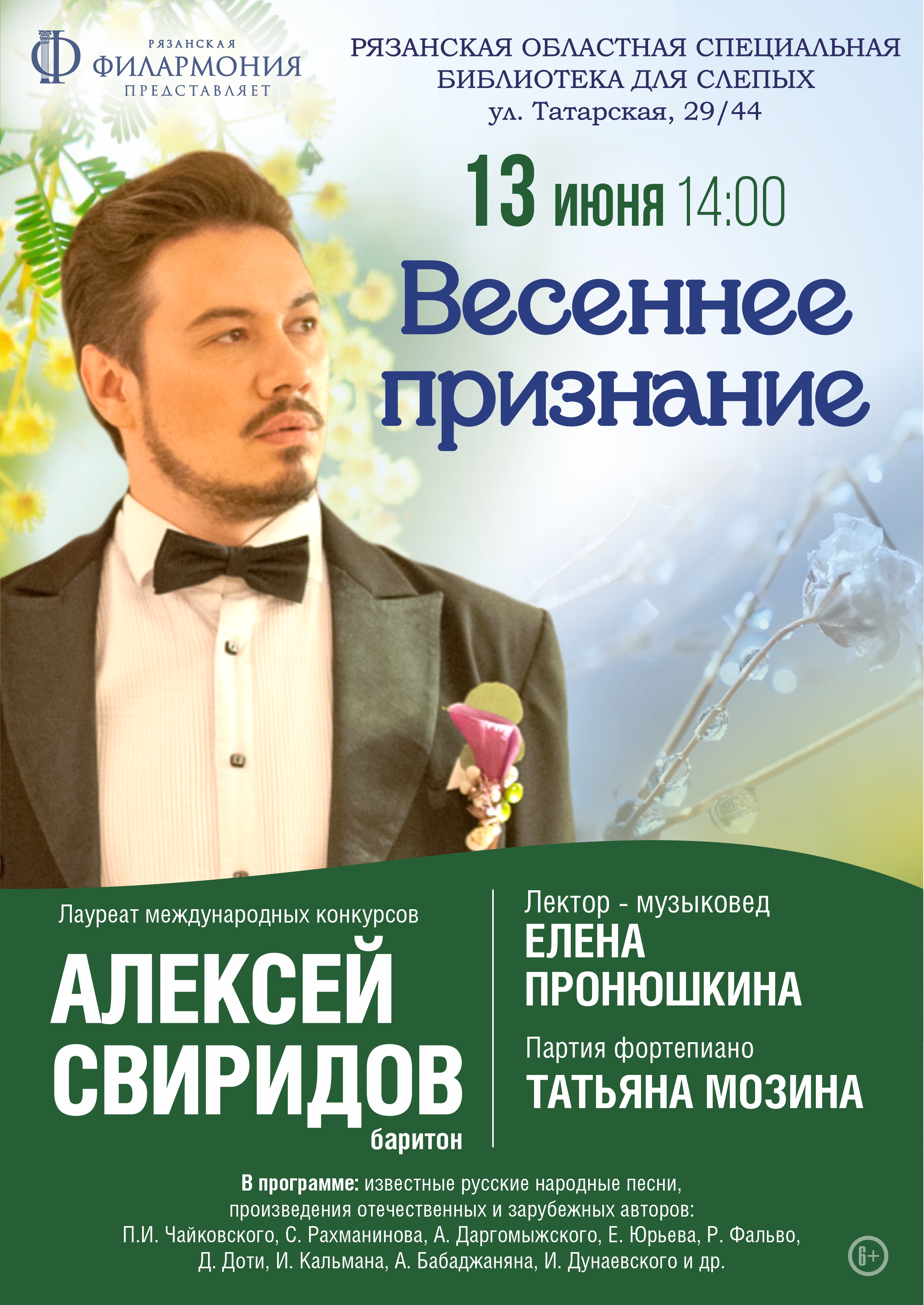 Концерт солиста Рязанской областной филармонии, лауреата международных конкурсов Алексея Свиридова «Весеннее признание»Афиша