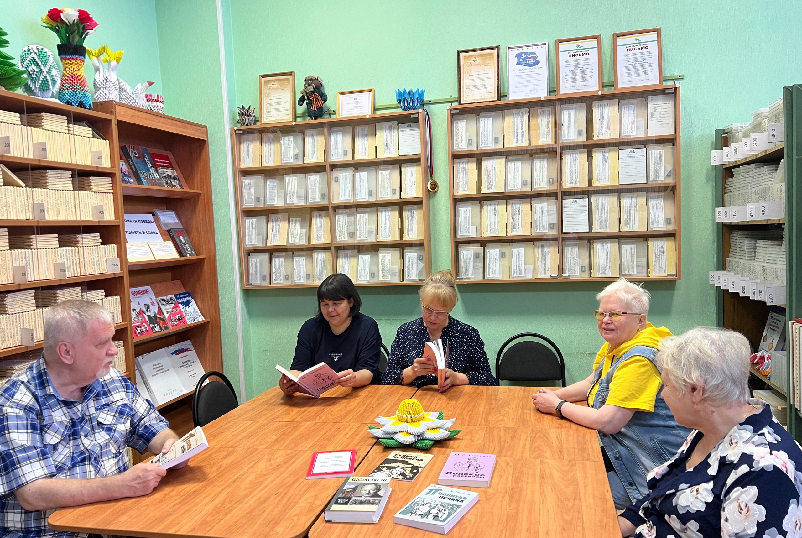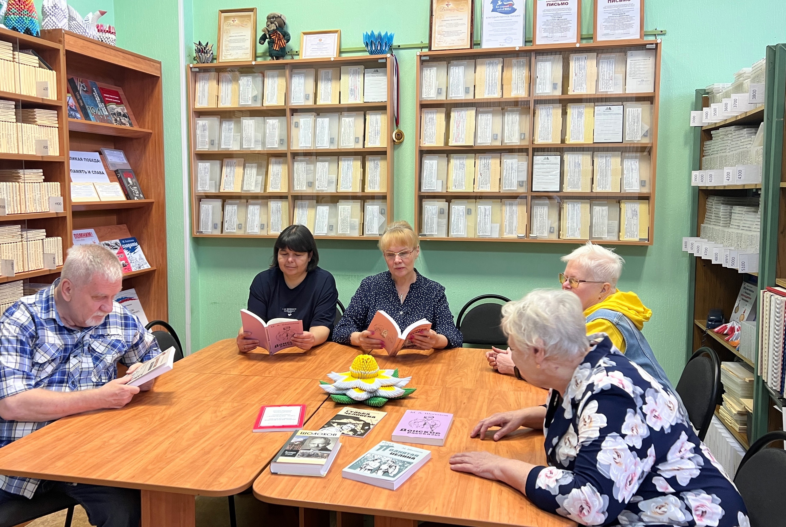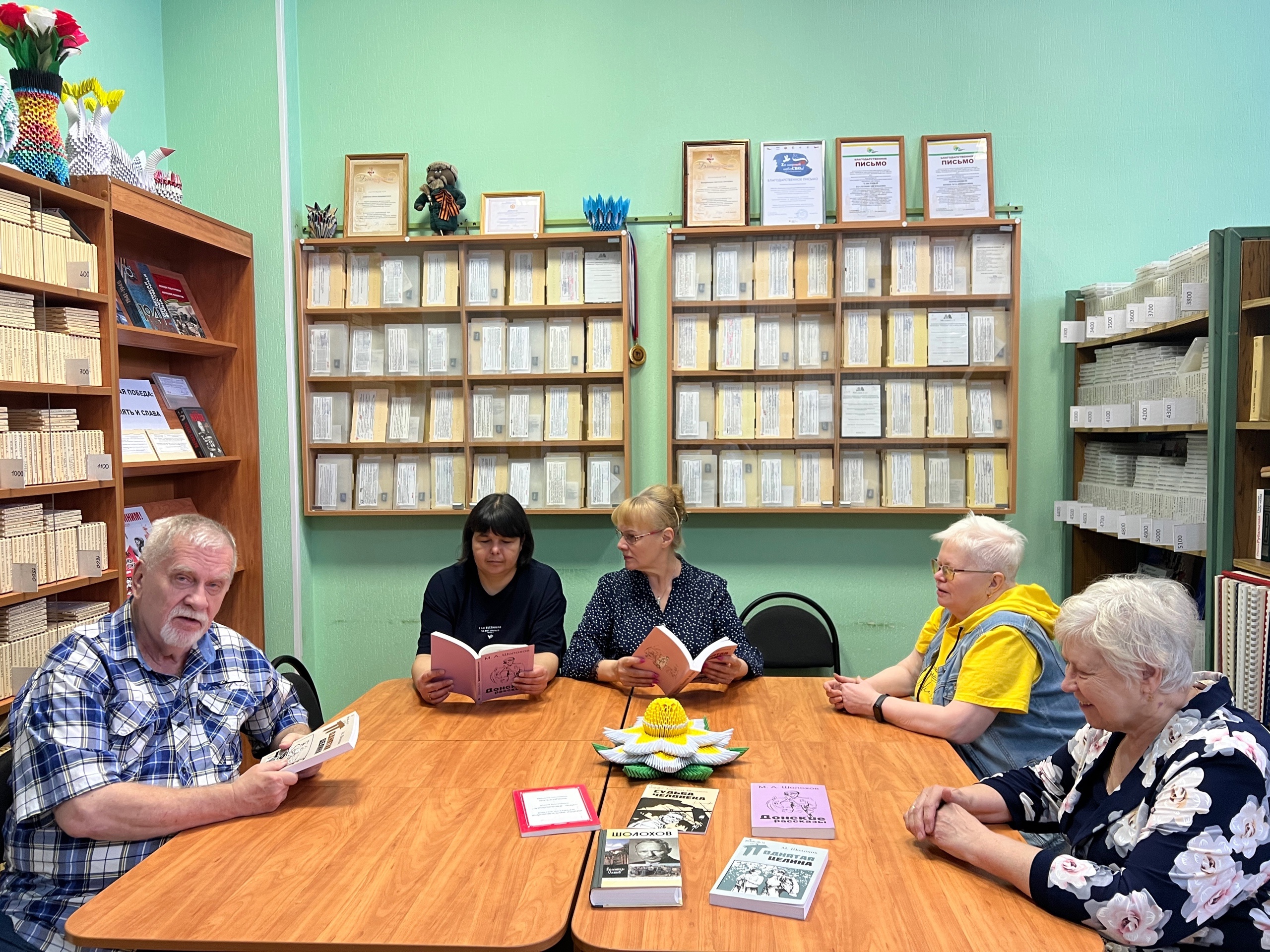 Кроме того, вниманию посетителей была представлена тематическая выставка книг, посвященная творчеству Шолохова. Здесь можно было найти произведения писателя, сборники статей и критических работ, а также материалы, касающиеся биографических аспектов жизни Шолохова.