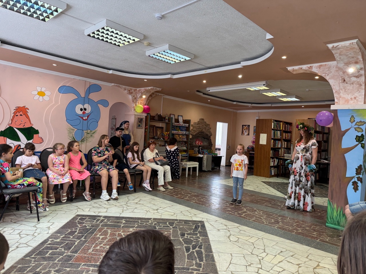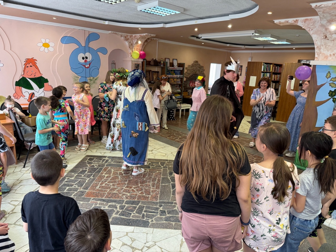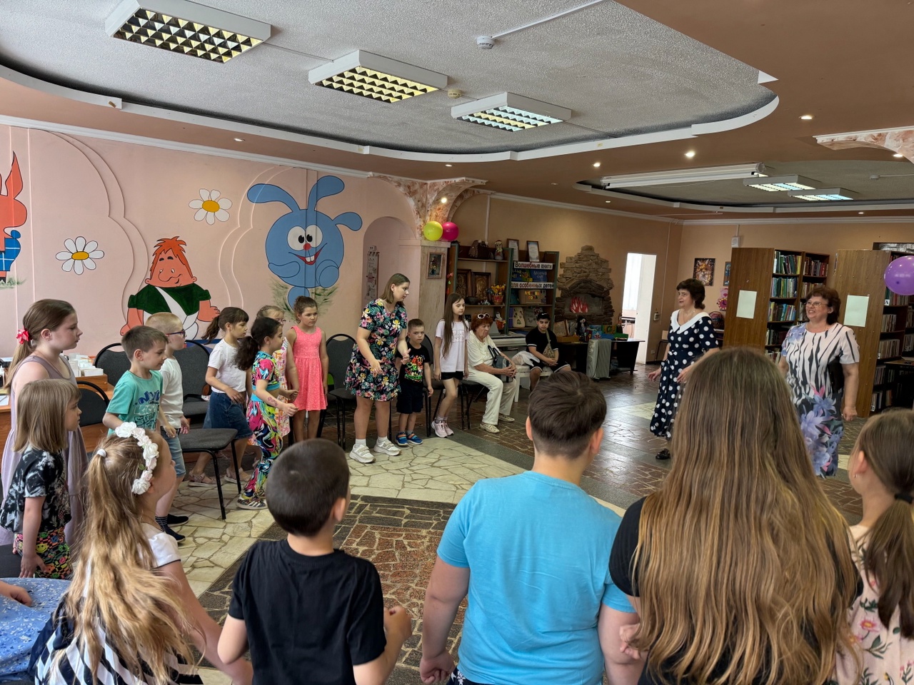 Заведующая детским отделом Валентина Петровна Гусева поздравила детей и их родителей с началом летних каникул, потом ребята встретились с Кащеем, Бабой Ягой, Петрушкой и Летом. Они отгадывали загадки, делали зарядку, участвовали в весёлых конкурсах и эстафетах, пели, танцевали и играли в подвижные игры.