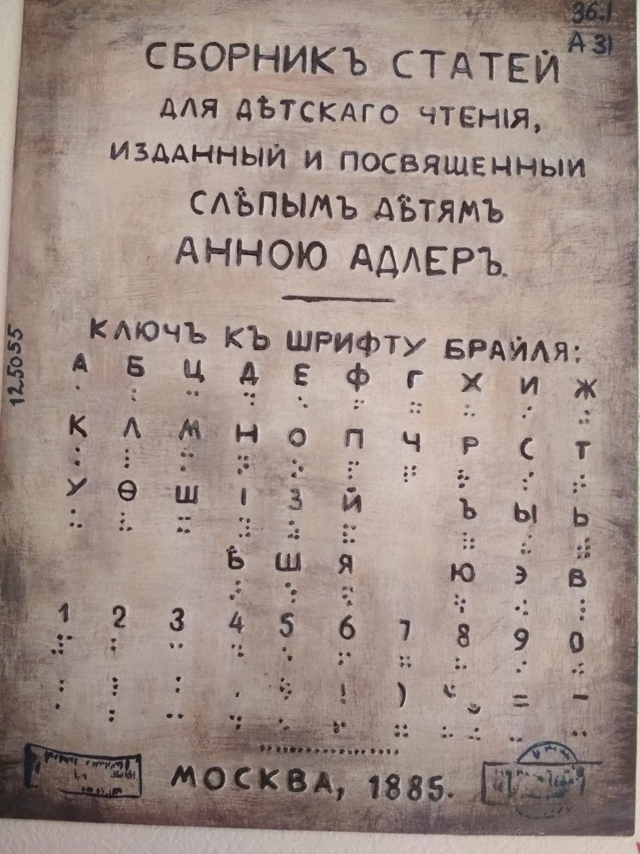 - в России первая книга по системе Брайля была издана А. А. Адлер в 1885 г.;