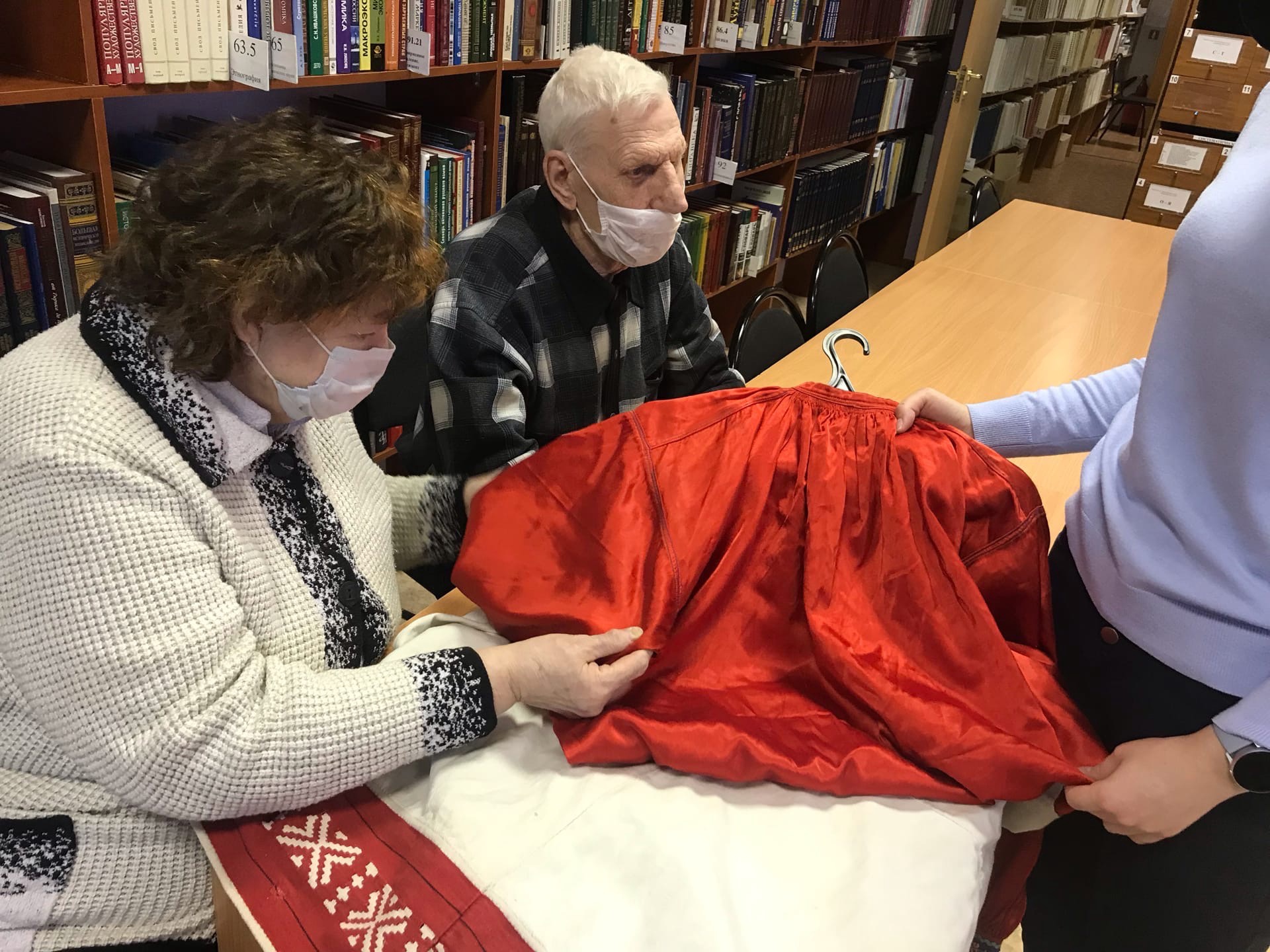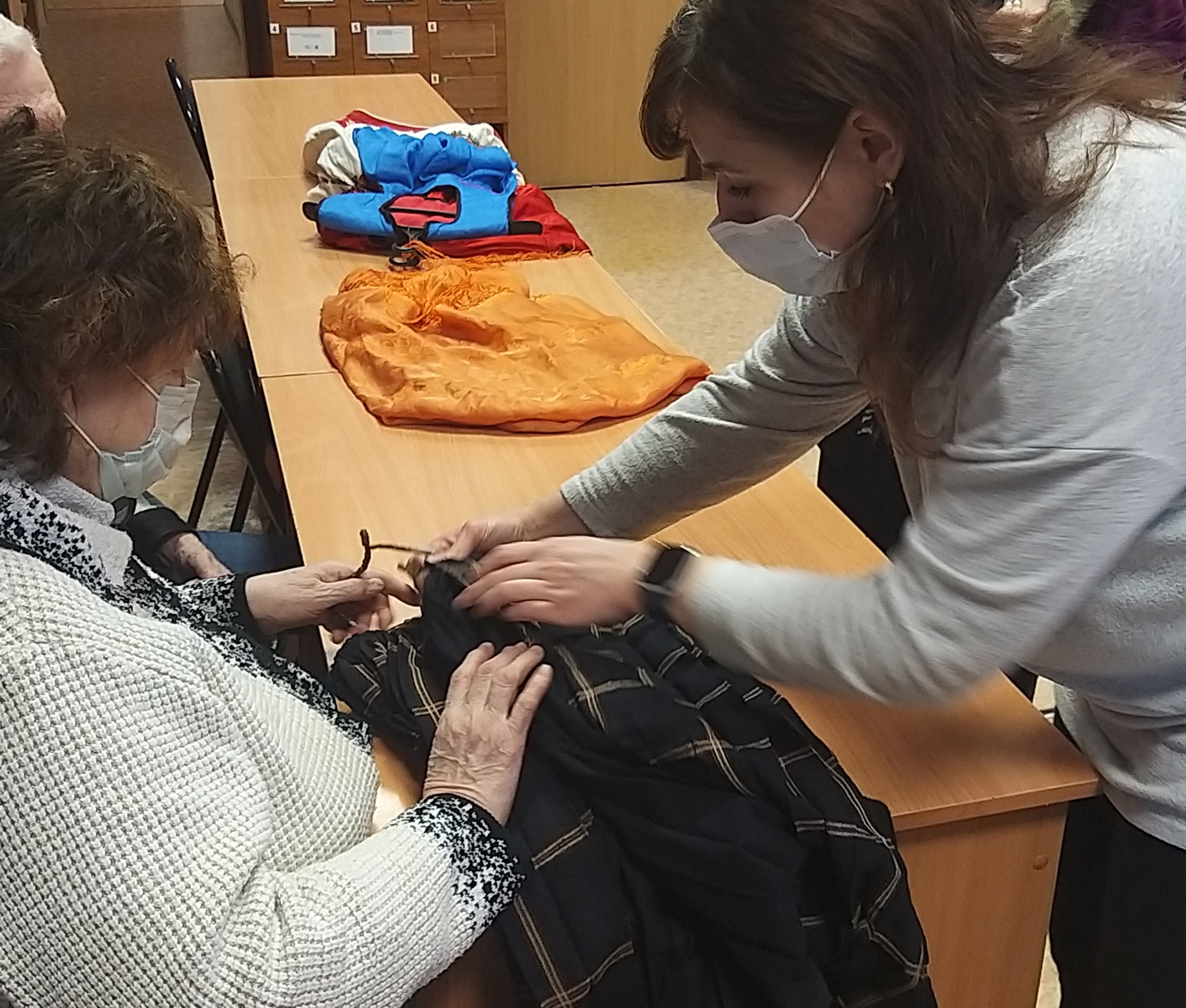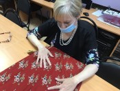 В процессе мероприятия незрячим читателям выдалась возможность «вживую» ознакомиться с деталями ряжского костюма: ощутить ткань, из которой сшиты рубаха, понёва и передник, примерить головной убор.