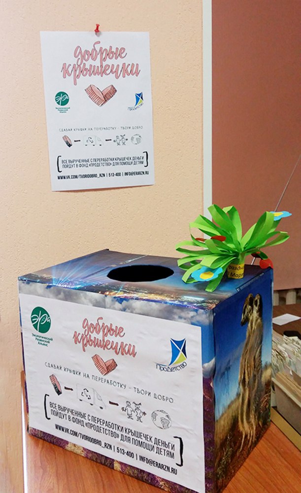 Для этого в каждом отделе библиотеки (абонемент, детский отдел и филиал) стоит специальный ящик, куда каждый может положить пластмассовые крышечки, которые в дальнейшим будут сданы на переработку, а деньги, полученные от переработки, будут направлены на повышение качества жизни детей из интернатных учреждений Рязанской области.