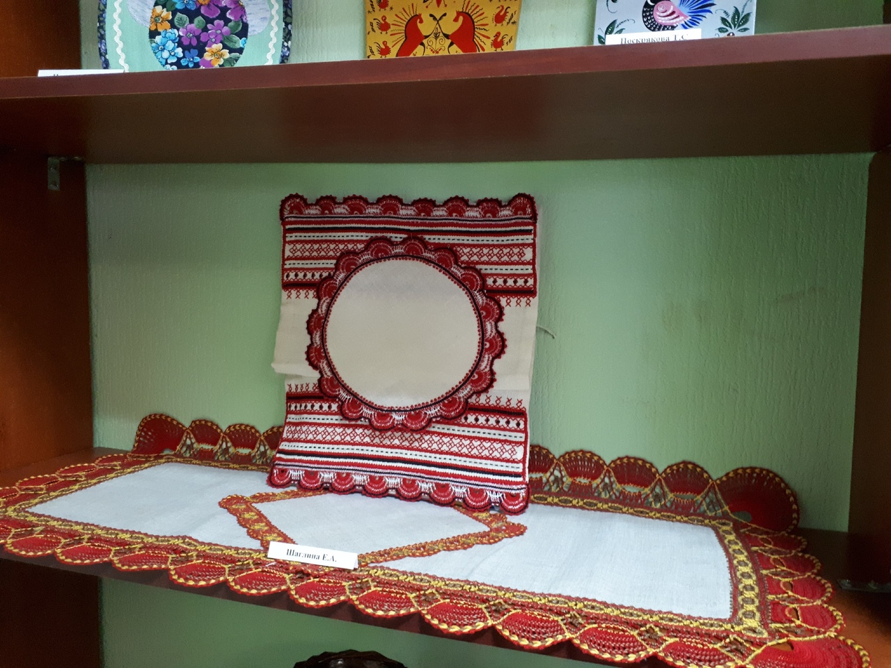 Свои работы представили Андрианова Т.Б. – кружевоплетение на коклюшках; Нестерова М.Б. – кружевоплетение на коклюшках, декупаж; Лаушкина А.В. – кружевоплетение на коклюшках; Поскрякова Т.С. – роспись по дереву; Орлова Л.Ф. – плетение из бумаги; Шаглина Е.А. – кружевоплетение на коклюшках.