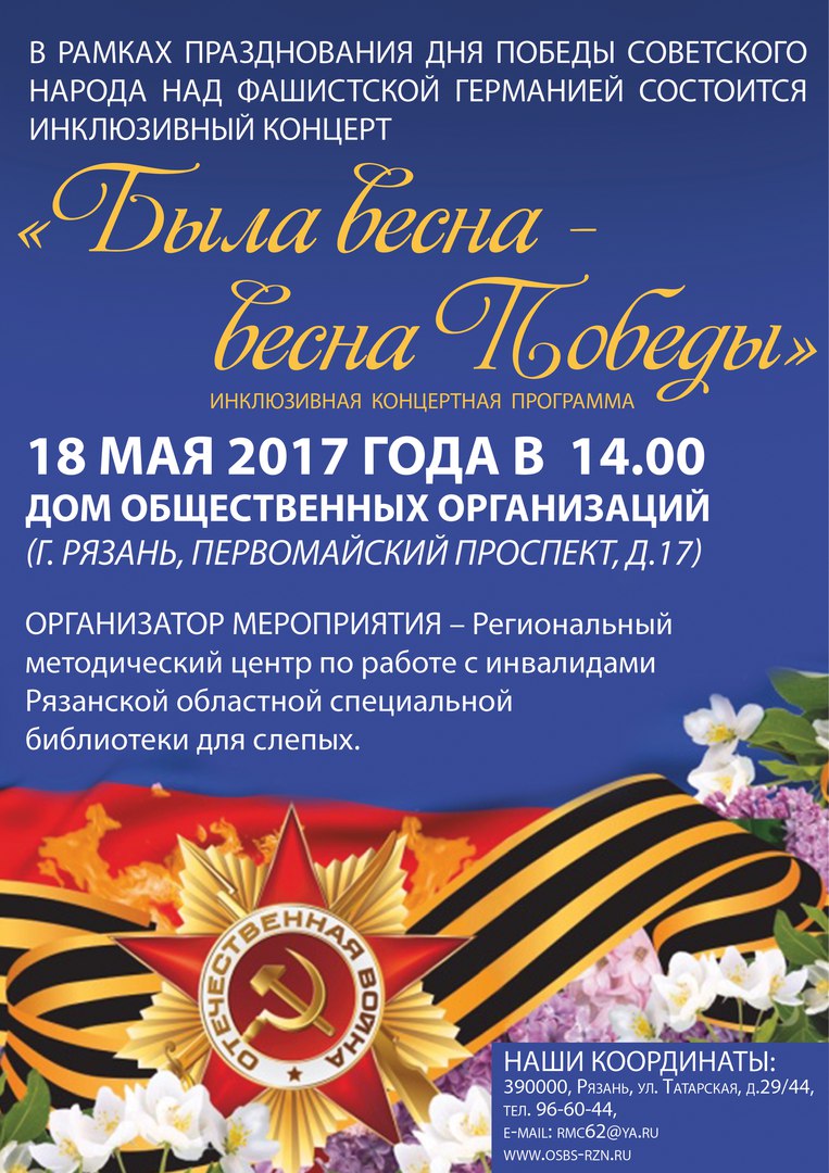 18 мая 2017 года в Доме общественных организаций в рамках празднования 72-й годовщины Победы советского народа над фашистской Германией состоялся инклюзивный концерт «Была весна – весна Победы». Организатором мероприятия выступил Региональный методический центр по работе с инвалидами Рязанской областной специальной библиотеки для слепых.