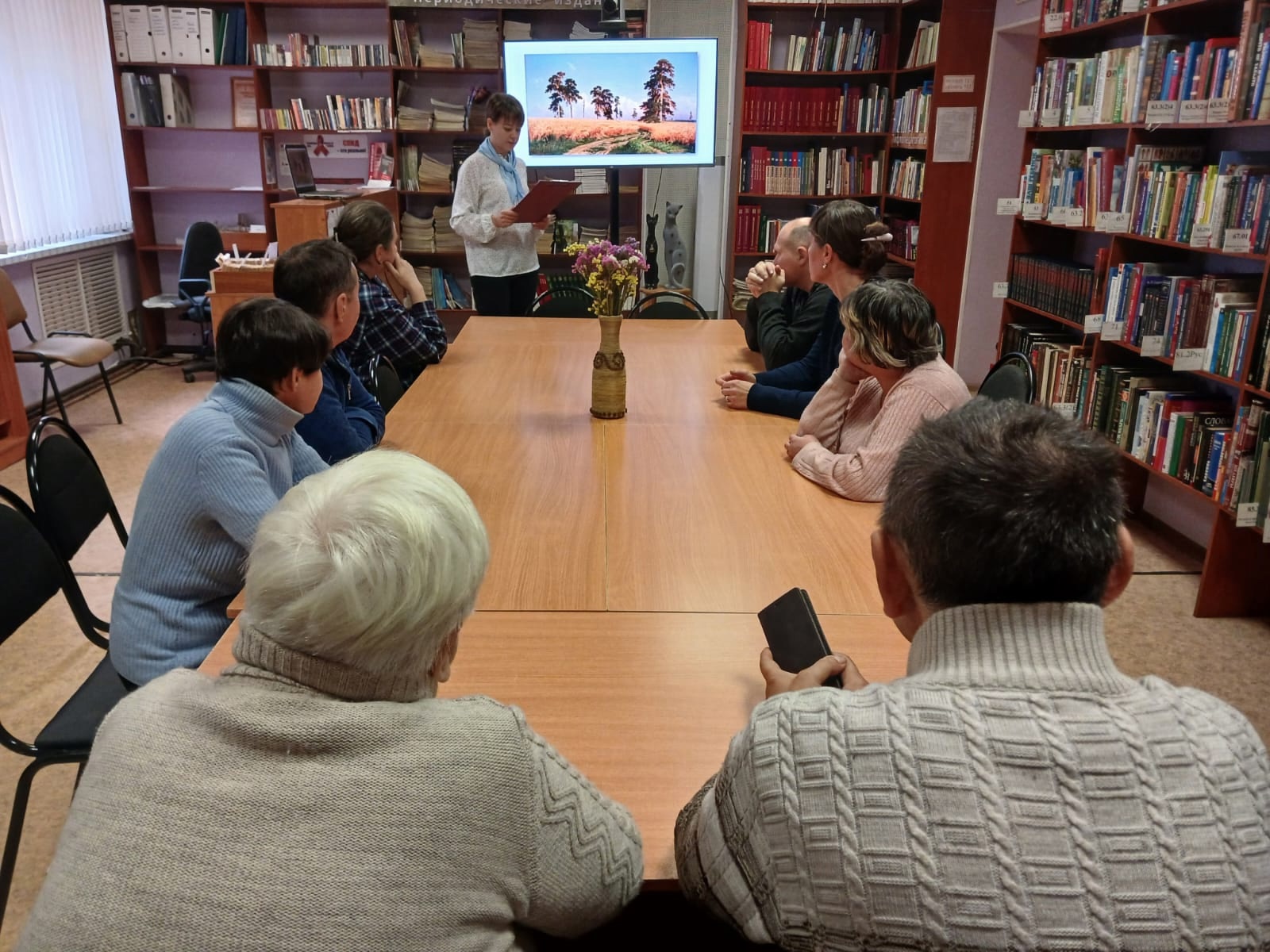 Сотрудники библиотеки задавали вопросы участникам в формате текстовых вопросов и иллюстраций. Атмосфера в зале была оживленной, читатели активно участвовали, обсуждали вопросы между собой.