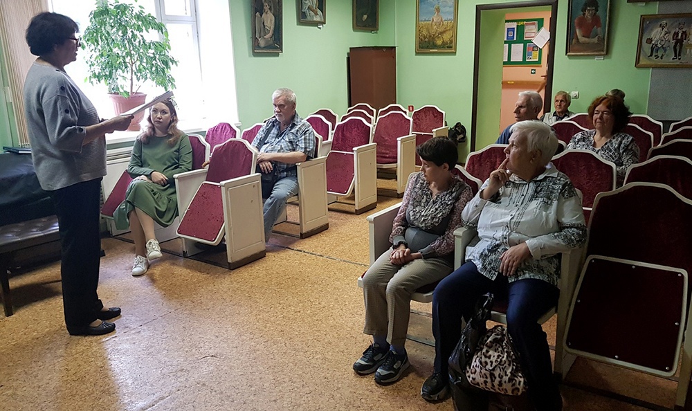 Ведущие вечера, заведующая тифлоинформационным отделом Татьяна Николаевна Бритенкова и заведующая отделом комплектования Татьяна Олеговна Миндорина, рассказали о жизненном и творческом пути Евгения Фёдоровича.