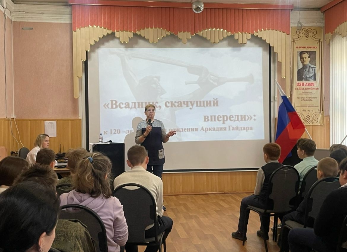Главный библиотекарь Регионального методического центра по работе с инвалидами Смирнова О.А. рассказала о том, как подростком четырнадцати лет в 1918 году Гайдар ушёл на фронт гражданской войны, а в 19 лет командовал полком, как комиссованный из армии по контузии пришёл в литературу, о творческом пути, интересных случаях в его жизни и героической гибели.