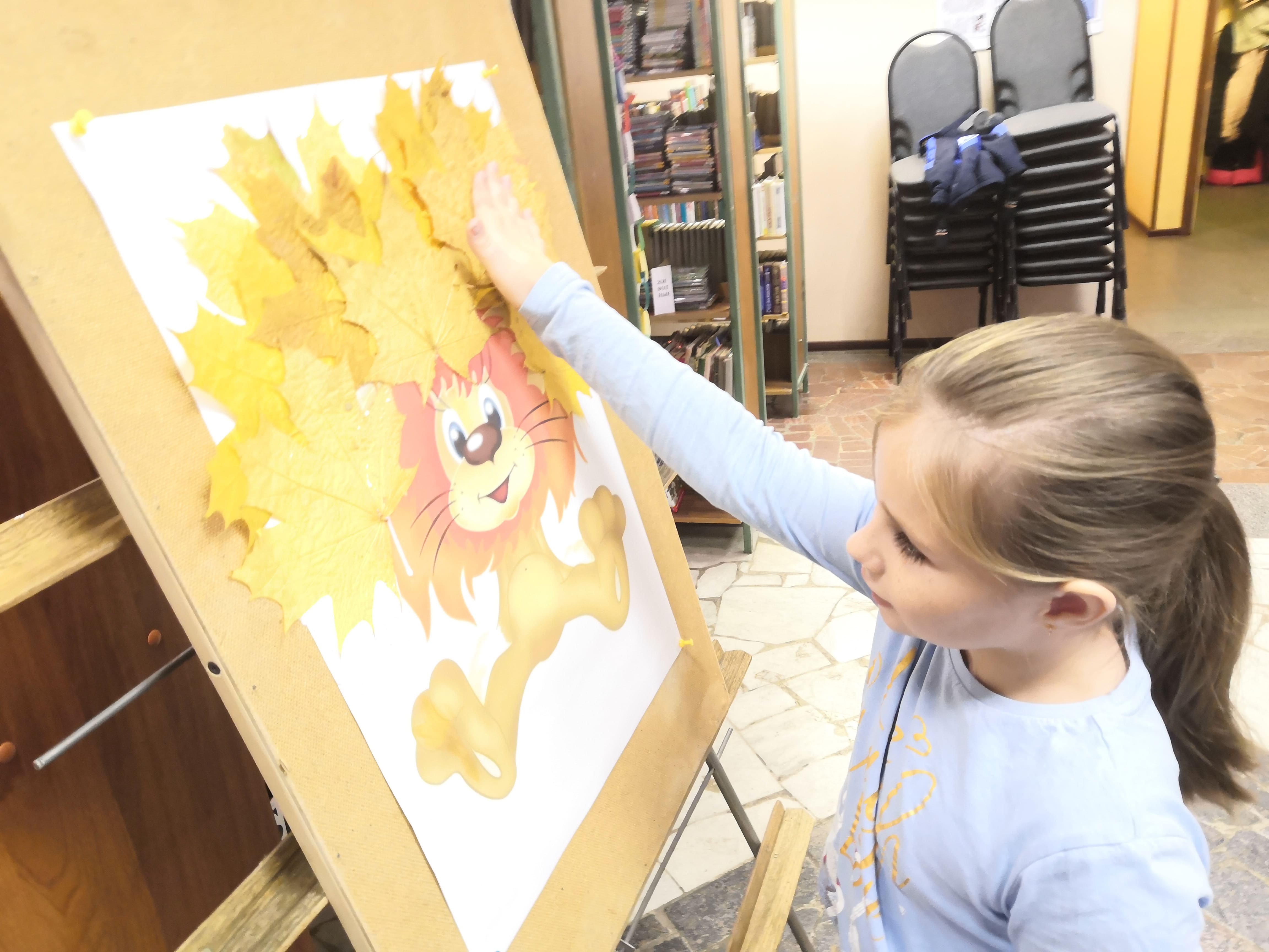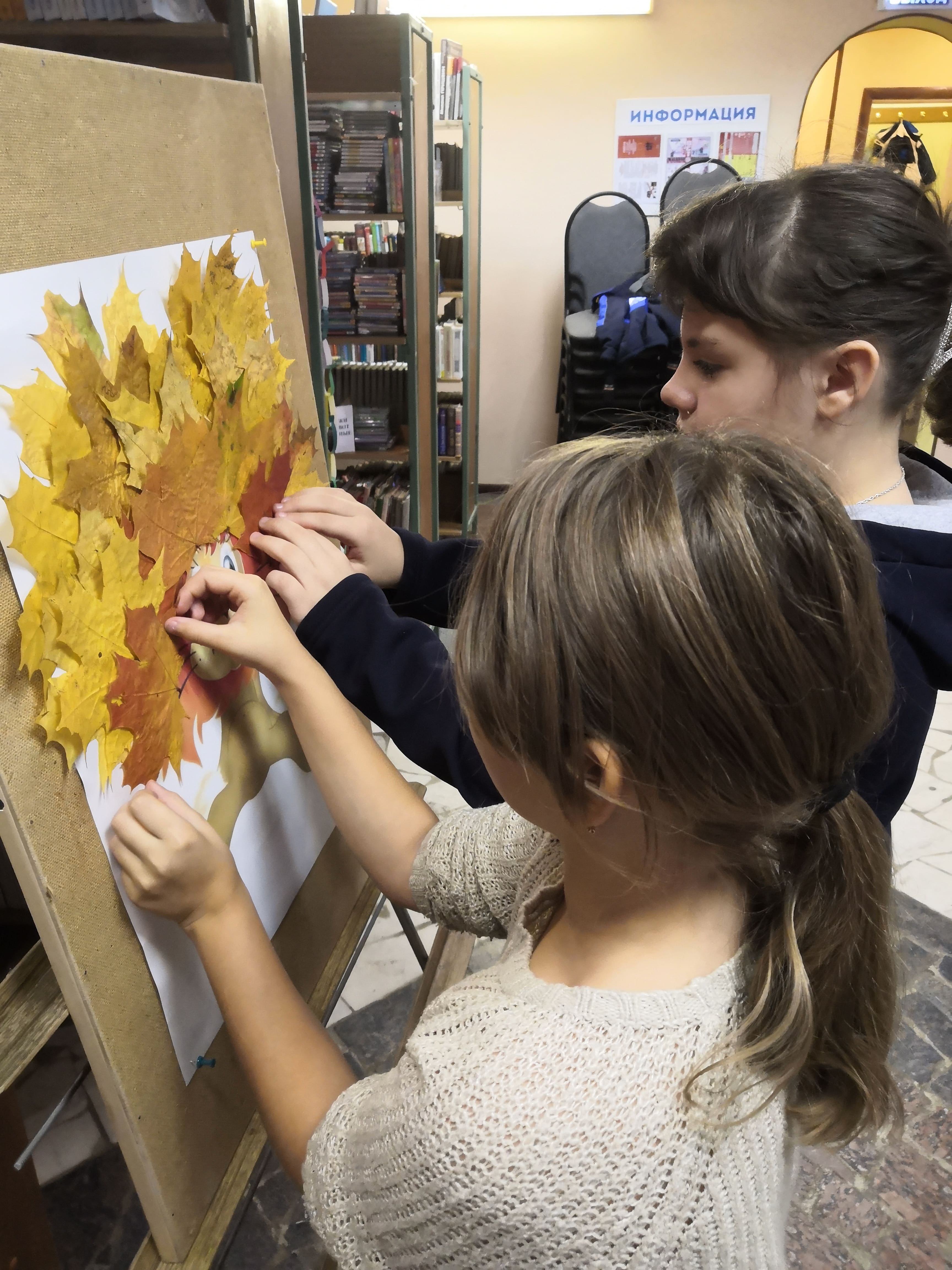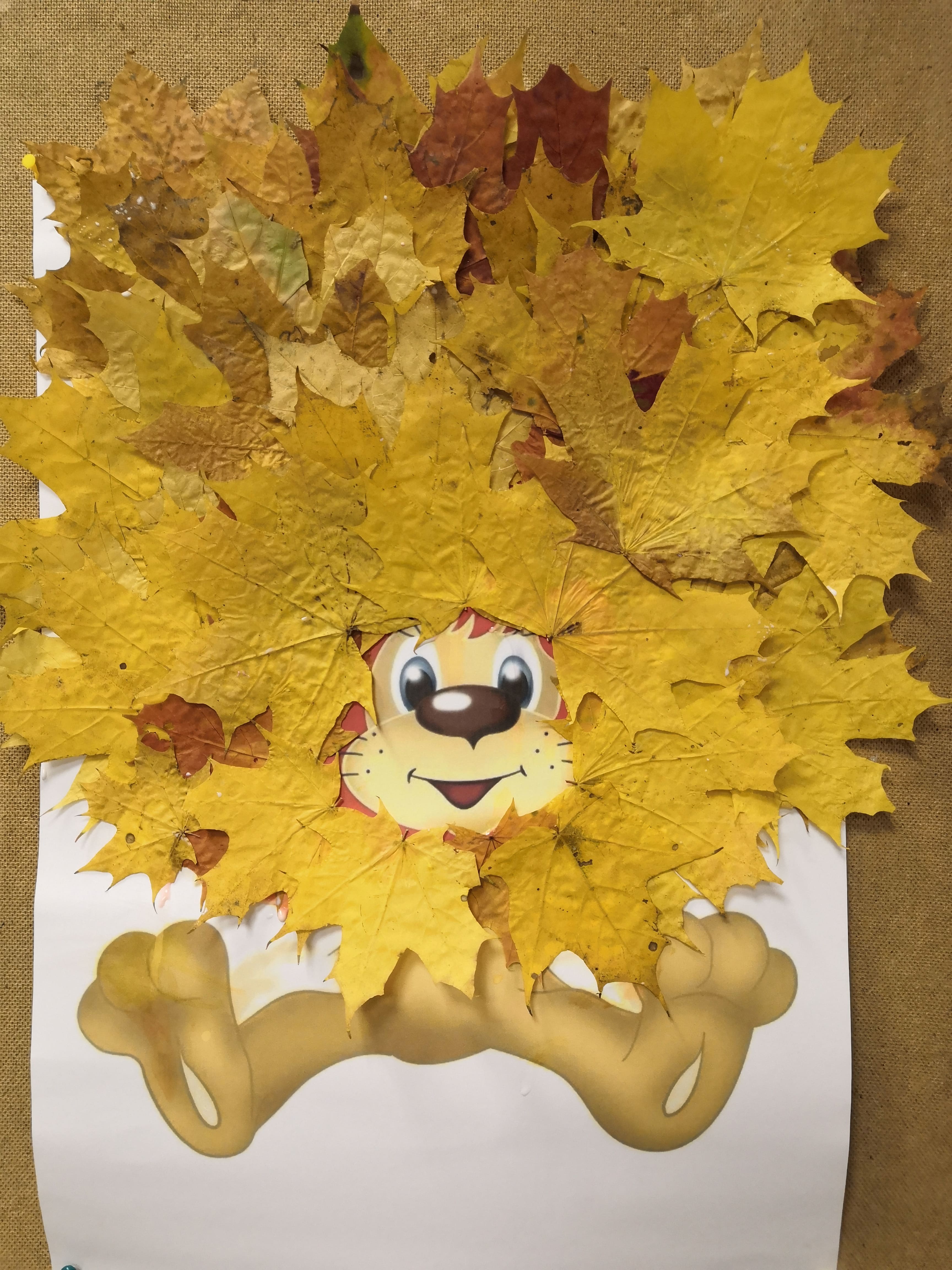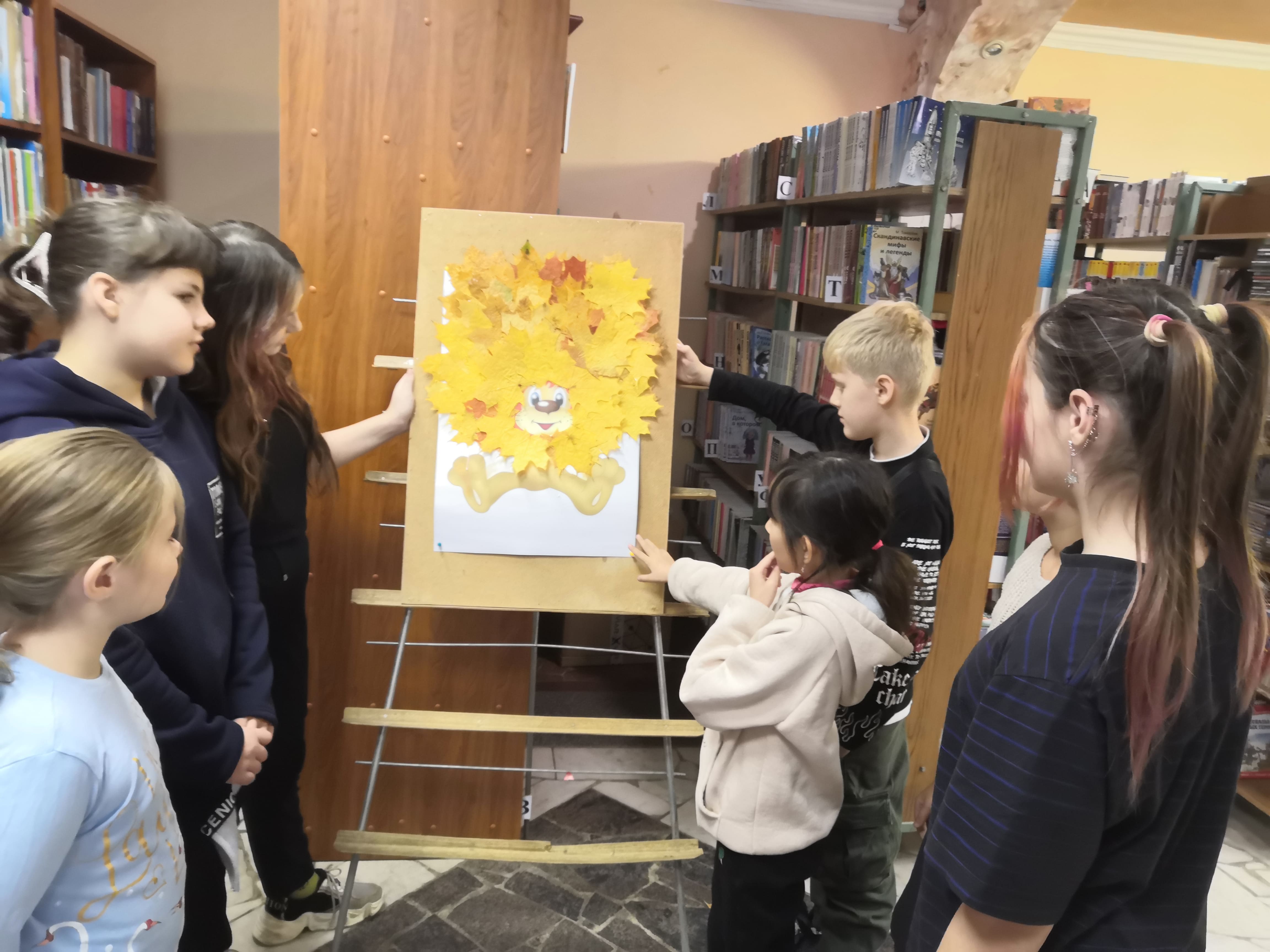 Под руководством работников отдела ребята сделали из листьев аппликацию львенка из мультфильма «Как Львенок и Черепаха пели песню».