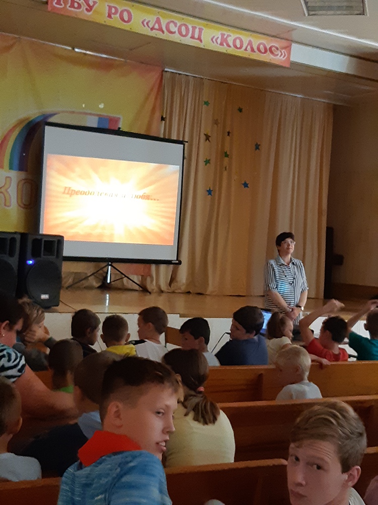 8 июля 2019 года в День семьи, любви и верности в ГБУ РО «ДОСЦ «Колос» для смены детей с ограниченными возможностями здоровья сотрудники Регионального методического центра по работе с инвалидами провели медиалекцию «Преодолевая и любя» из цикла «Дух не бывает инвалидом». Тема любви к творчеству, к спорту, к другому человеку была раскрыта в рассказе о жизни знаменитых и неизвестных людей с инвалидностью.