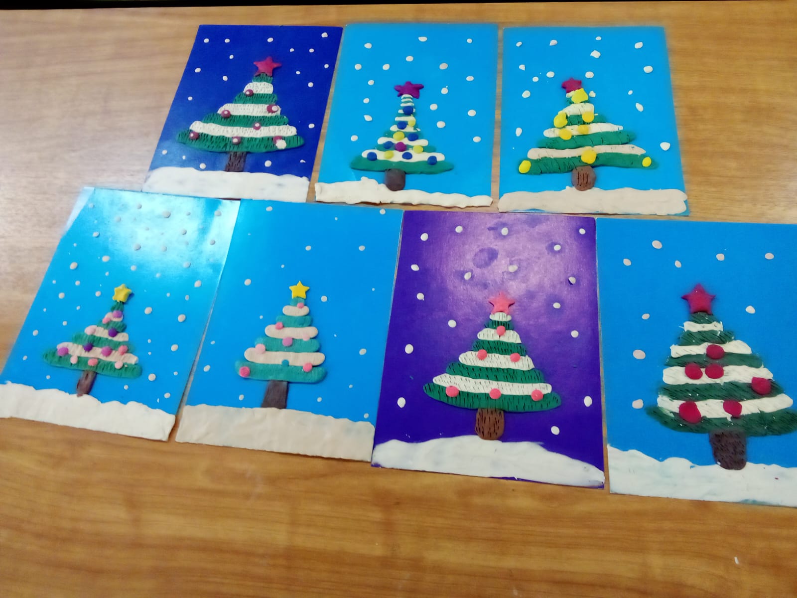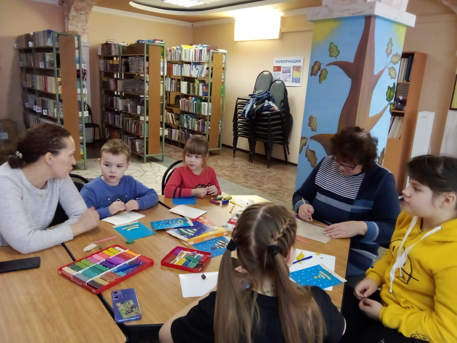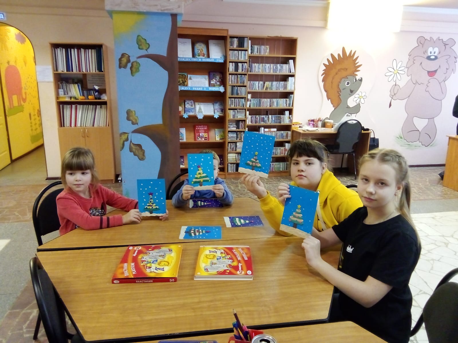Ребята под руководством заведующей отделом Валентины Петровны Гусевой сделали изображения новогодней ёлочки в технике пластилинографии. На листах синего картона они выполняли аппликации из тонких полосок пластилина. Все поделки получились очень красивыми!