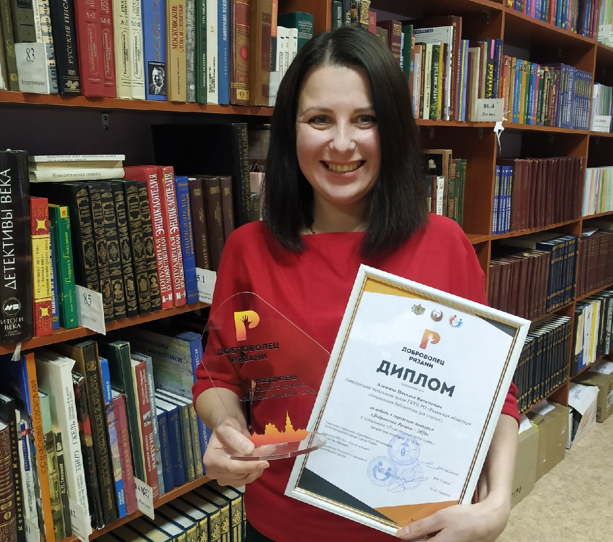 Алешина Наталья Витальевна, заведующая читальным залом ГБУК РО «Рязанская областная специальная библиотека для слепых», стала победителем городского конкурса «Доброволец Рязани – 2020» в номинации «Рожденные помогать» в возрастной категории от 18 лет с проектом «Тепло сердец»: социально-культурная реабилитация людей с психоневрологическими расстройствами при поддержке «серебряных» волонтеров Рязанской области. Поддержка проекта осуществлена благотворительным фондом «Хорошие истории» на средства, предоставленные АО «Райффайзенбанк».
