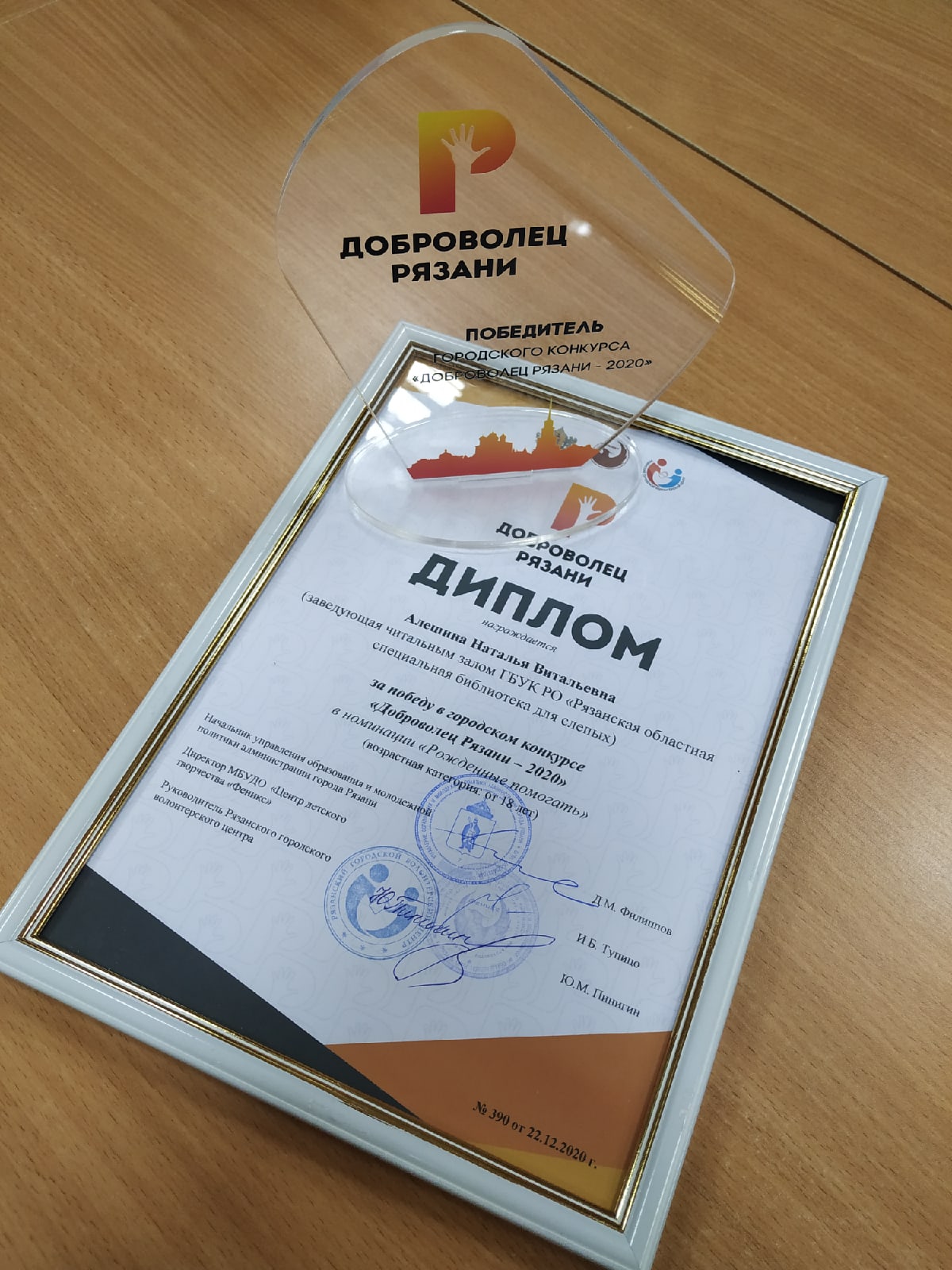 23 декабря 2020 года в Центральной городской библиотеке имени С.А. Есенина состоялось вручение премии «Доброволец года – 2020». Организаторами мероприятия выступили управление образования и молодежной политики администрации города Рязани, Центр детского творчества «Феникс» и Рязанский городской волонтерский центр при поддержке Ресурсного центра добровольчества Рязанской области. Подведение итогов конкурса состоялось в рамках торжественной церемонии подведения итогов добровольческой деятельности за 2020 год «Корабль доброй воли».