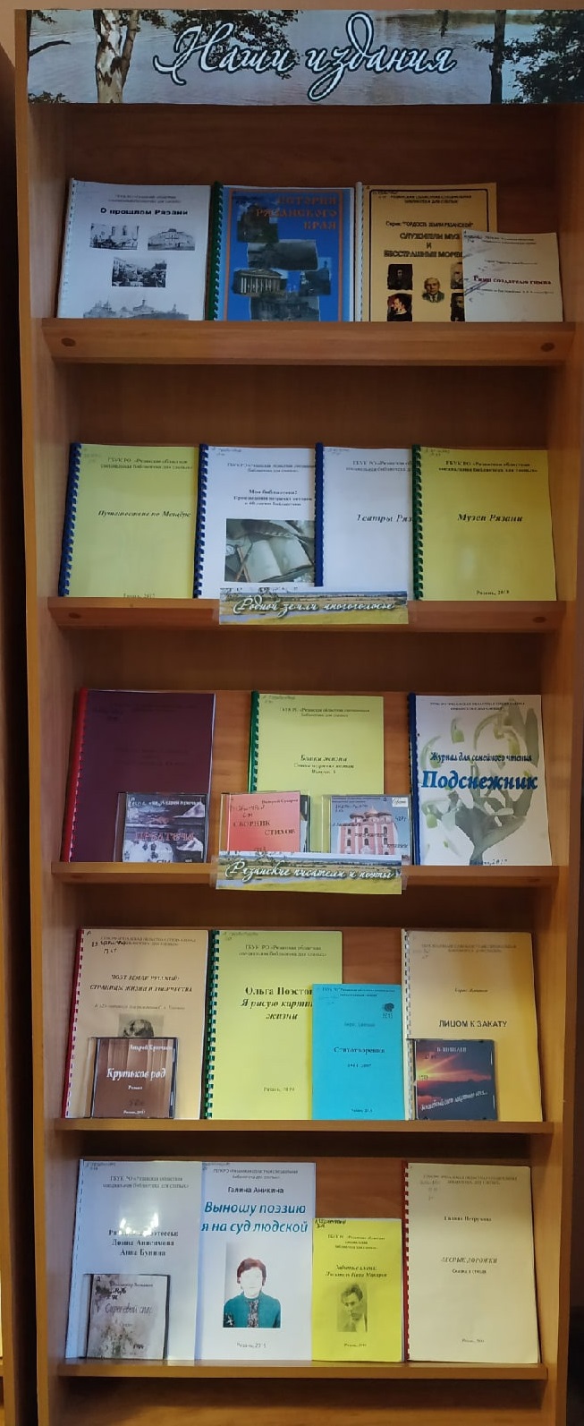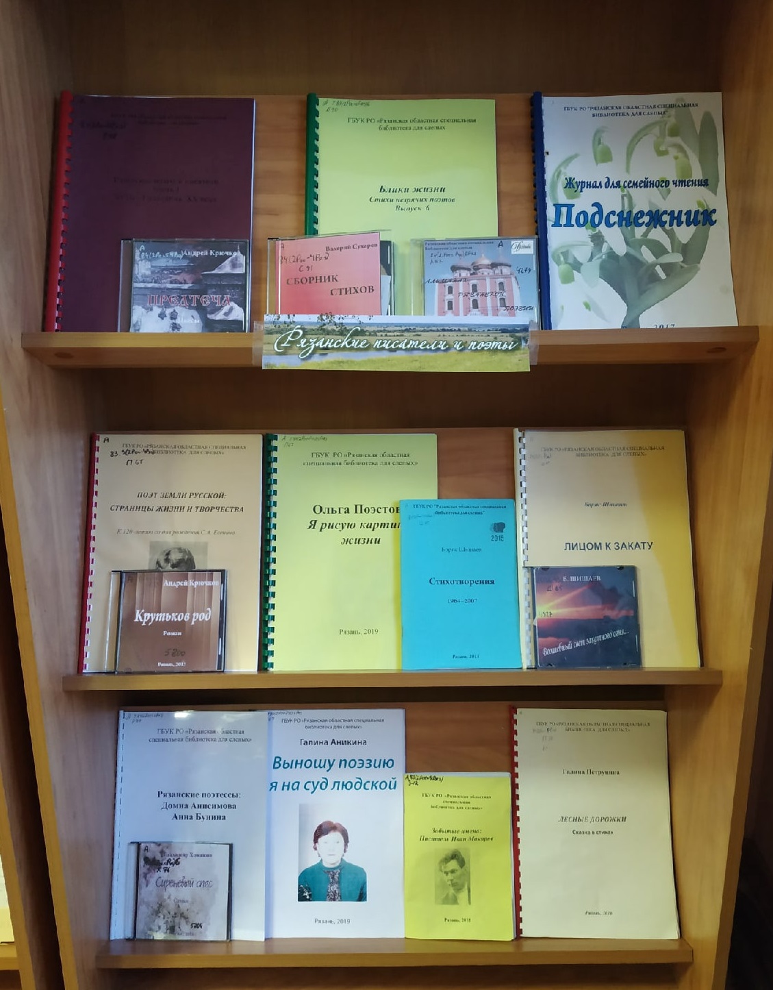 Второй раздел книжной выставки посвящён рязанским поэтам и прозаикам. Наряду с книгами широко известных авторов (С. Есенина, Б. Шишаева, В. Самарина и др.) представлены произведения незрячих авторов – читателей библиотеки (О. Поэстовой, Г. Аникиной, Г. Петруниной, В. Сухарева и др.).