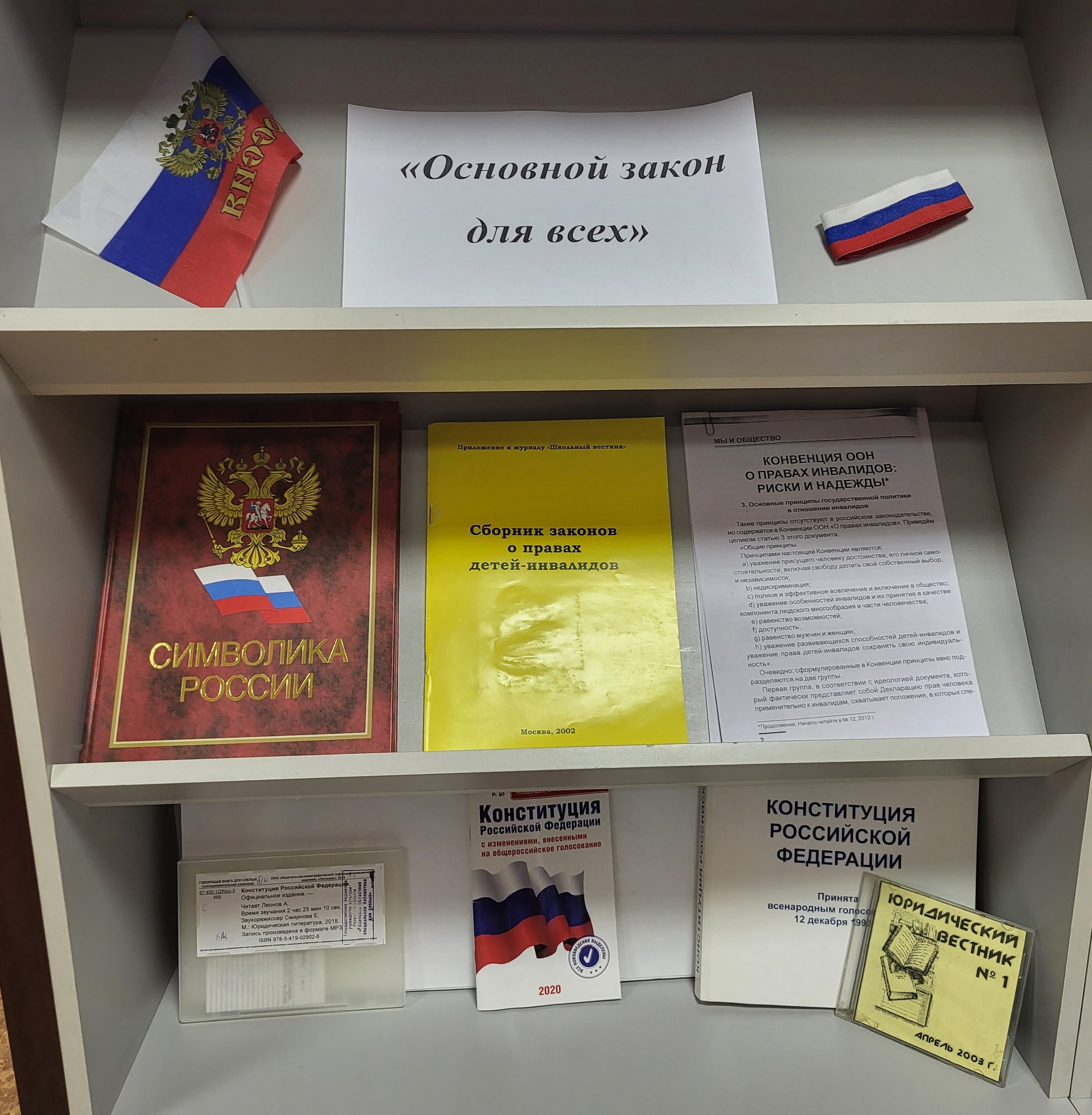 На выставке представлены Конституция РФ, Уголовный кодекс, Гражданский и Жилищный кодексы на специальных носителях для незрячих и слабовидящих, таких как шрифт Брайля, крупношрифтовая книга, флеш-карта.