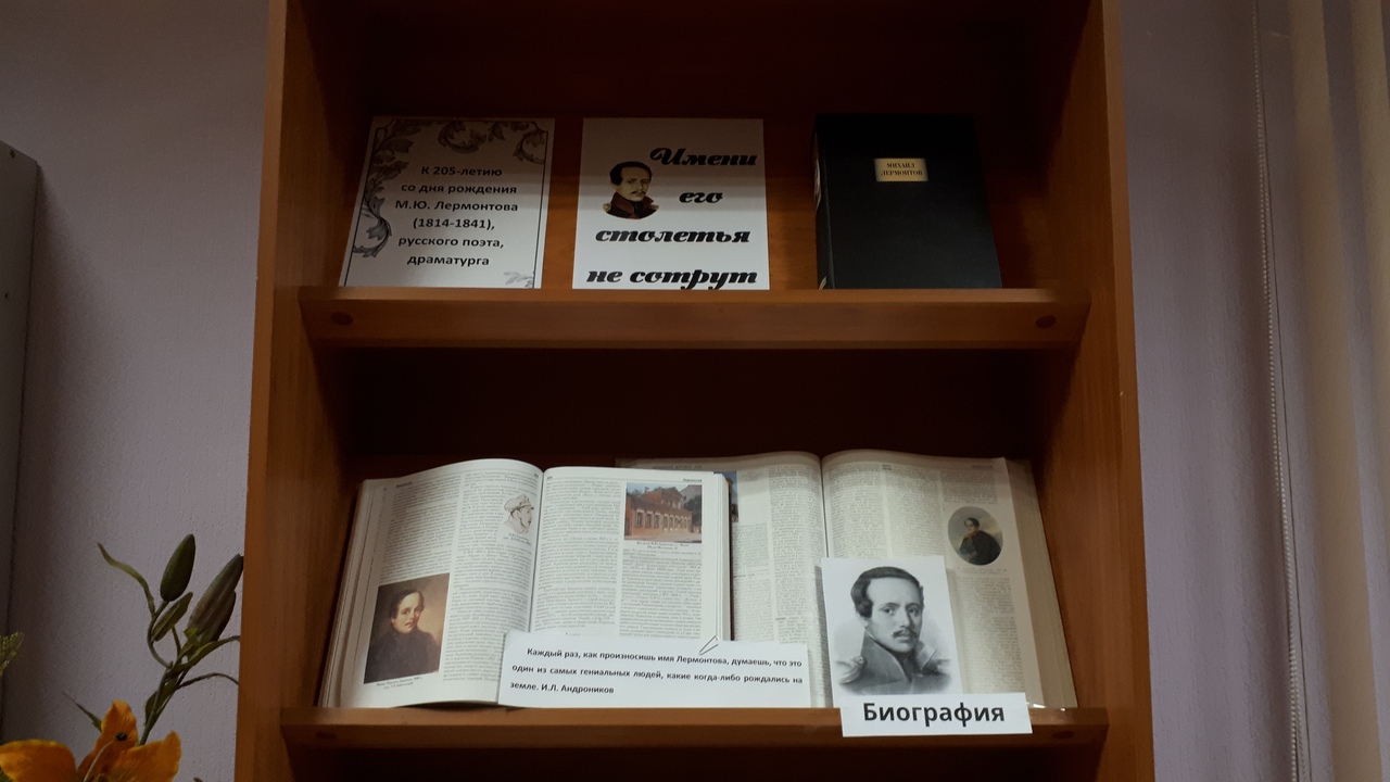 С 14 по 28 октября 2019 года в читальном зале Рязанской областной специальной библиотеки для слепых пройдет книжная выставка «Имени его столетья не сотрут», посвященная 205-летию со дня рождения Михаила Юрьевича Лермонтова.