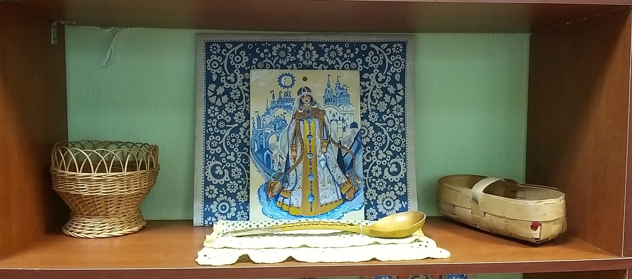 На небольшой выставке представлено 43 работы таких авторов как Нестерова М.Б., Андрианова Т.Б., Орлова П.Ф., Фадеева Р.Н., Поскрякова Т.С., Лебедева Н.Д., среди которых декоративные доски с мезенской и городецкой росписью, вязанные крючком скатерти, кузовок под ягоды из щепы, плетеные ажурные вазы из лозы, деревянные матрешки, керамический квасник и многое другое.