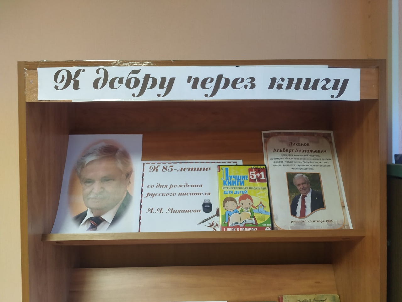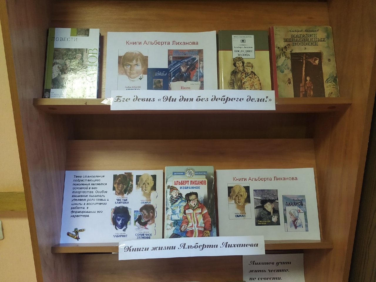 С 7 по 21 сентября 2020 года в отделе обслуживания ГБУК РО «Рязанская областная библиотека для слепых» представлена книжная выставка «К добру через книгу», посвященная 85-летию со дня рождения Альберта Анатольевича Лиханова.
