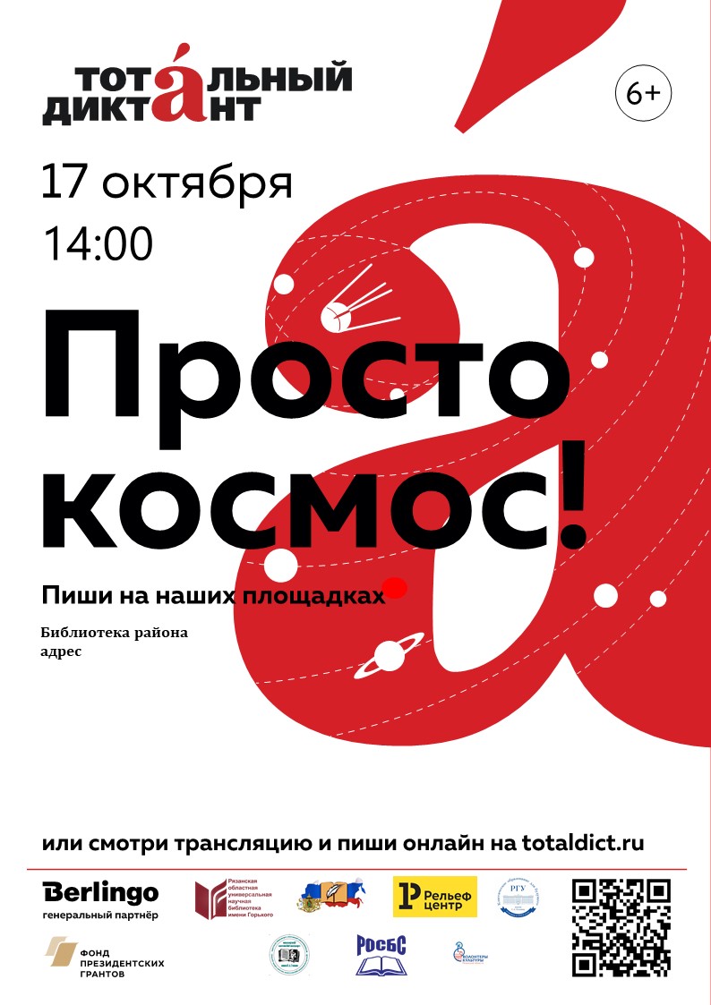 Партнеры «Тотального диктанта»: Рязанский государственный университет имени С.А. Есенина, компания «Рельеф-центр», Центральная городская библиотека имени С.А. Есенина, Рязанская областная специальная библиотека для слепых, Волонтеры культуры Рязанской области.