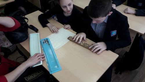 13 ноября отмечается Международный день слепых, так как в этот день родился первый тифлопедагог Валентин Гаюи. Работники детского отдела рассказали детям о его просветительской деятельности, а также о Луи Брайле – гениальном изобретателе письменности для слепых. Потом ребята с помощью брайлевского алфавита читали слова, выложенные на разборной азбуке. После этого семиклассники попробовали «читать» рельефно-графические изображения с завязанными глазами. Очень непросто оказалось распознавать руками изображения животных, храмов и т.д.