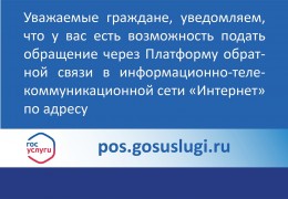 Уважаемые граждане, уведомляем, что у вас есть возможность подать обращение через Платформу обратной связи в информационно-телекоммуникационной сети "Интернет" по адресу pos.gosuslugi.ru.