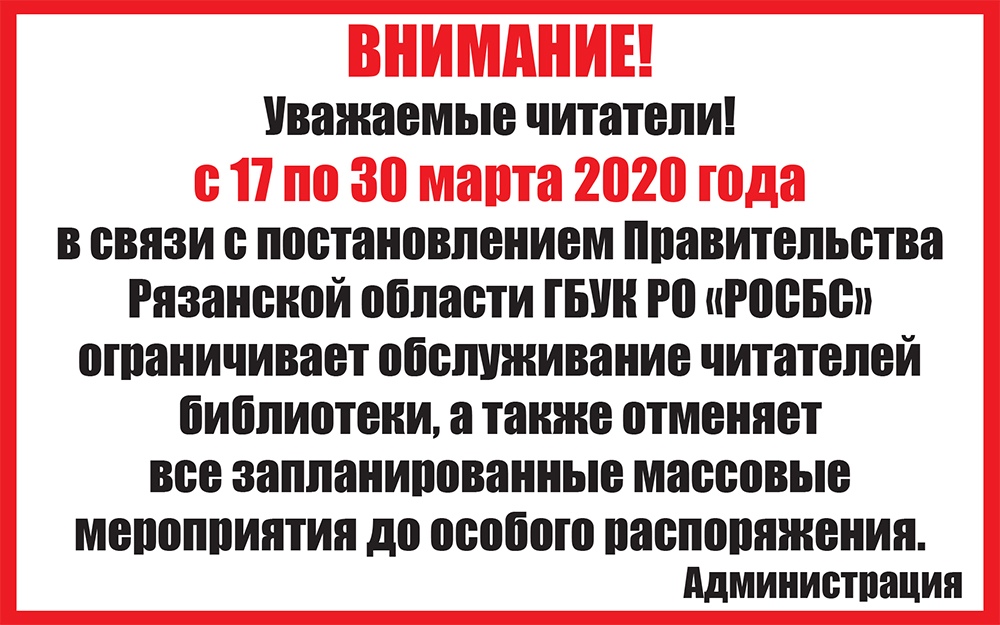 В связи с постановлением Правительства Рязанской области на период с 17 по 30 марта 2020 года ГБУК РО «РОСБС» ограничивает обслуживание читателей библиотеки, а также отменяет все запланированные массовые мероприятия до особого распоряжения.