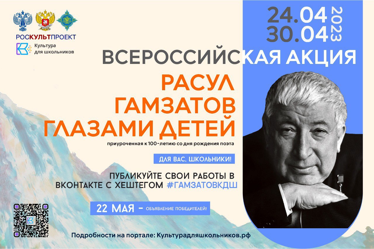 С 24 апреля по 22 мая 2023 года в рамках национального проекта «Культура для школьников» пройдет Всероссийская акция «Расул Гамзатов глазами детей», приуроченная к 100-летию со дня рождения поэта.