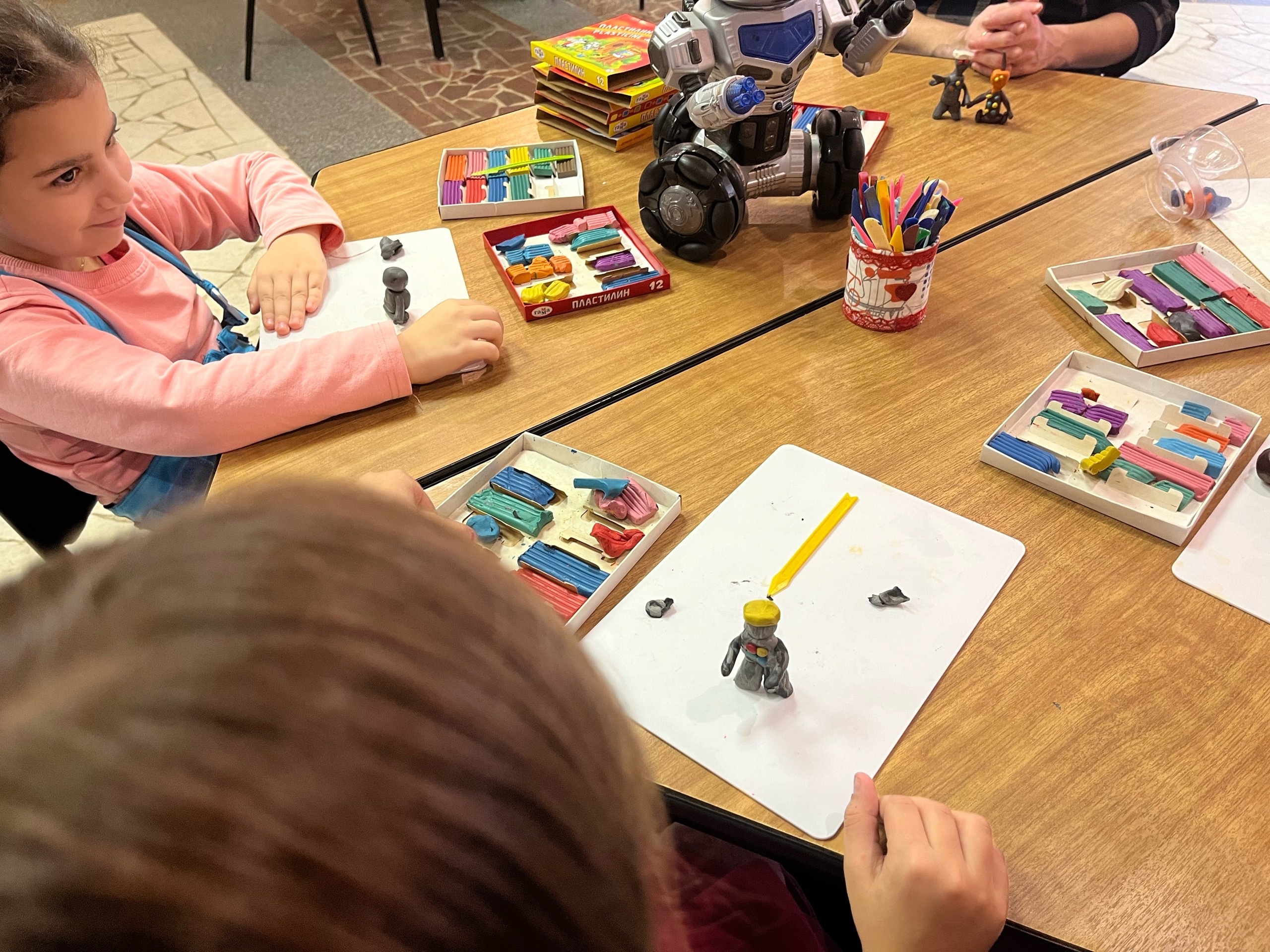Сотрудники детского отдела побеседовали с ребятами о том, как появилось слово «робот» и где мы можем встретиться с роботами, какие бывают роботы внешне и по характеру. Затем дети под руководством педагогов приступили к лепке роботов из пластилина. Дело оказалось не таким уж лёгким, потому что некоторые роботы никак не хотели стоять на ногах и их пришлось усовершенствовать. Для наглядности перед детьми поставили игрушечного интерактивного робота Электрона, который умеет разговаривать, танцевать и выполнять другие команды.