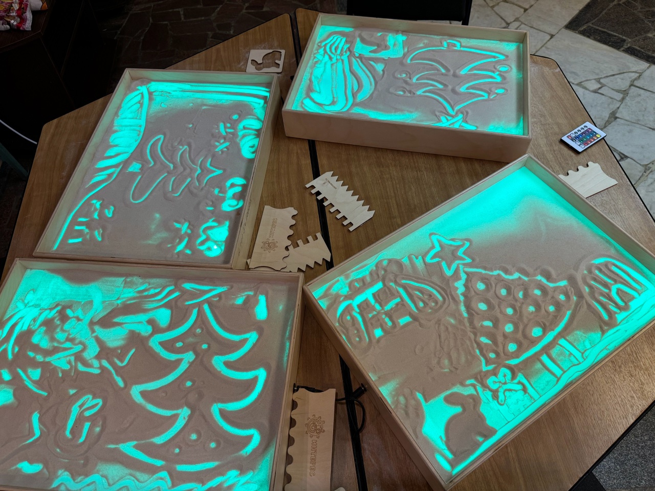 Потом ребята приступили к самому интересному – нарисовали на песочных планшетах ёлочку своей мечты. Совместное рисование на песочных планшетах, так же как и любая работа в команде, неизменно приносит нашим маленьким читателям большое удовольствие.