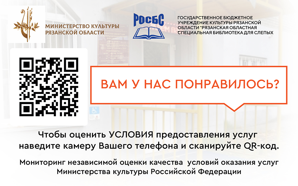 Министерство культуры Российской Федерации приглашает вас принять участие в независимой оценке качества условий предоставления услуг ГБУК РО «Рязанская областная специальная библиотека для слепых»!