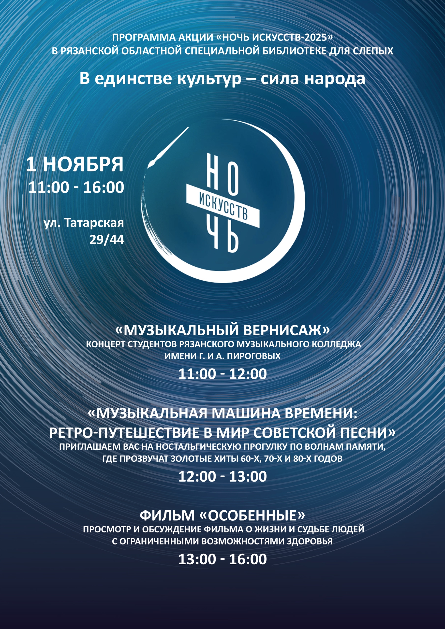 1 ноября 2025 года Рязанская областная специальная библиотека для слепых распахнула свои двери, превратившись в настоящий оазис творчества, где гости смогли окунуться в атмосферу незабываемой «Ночи искусств».