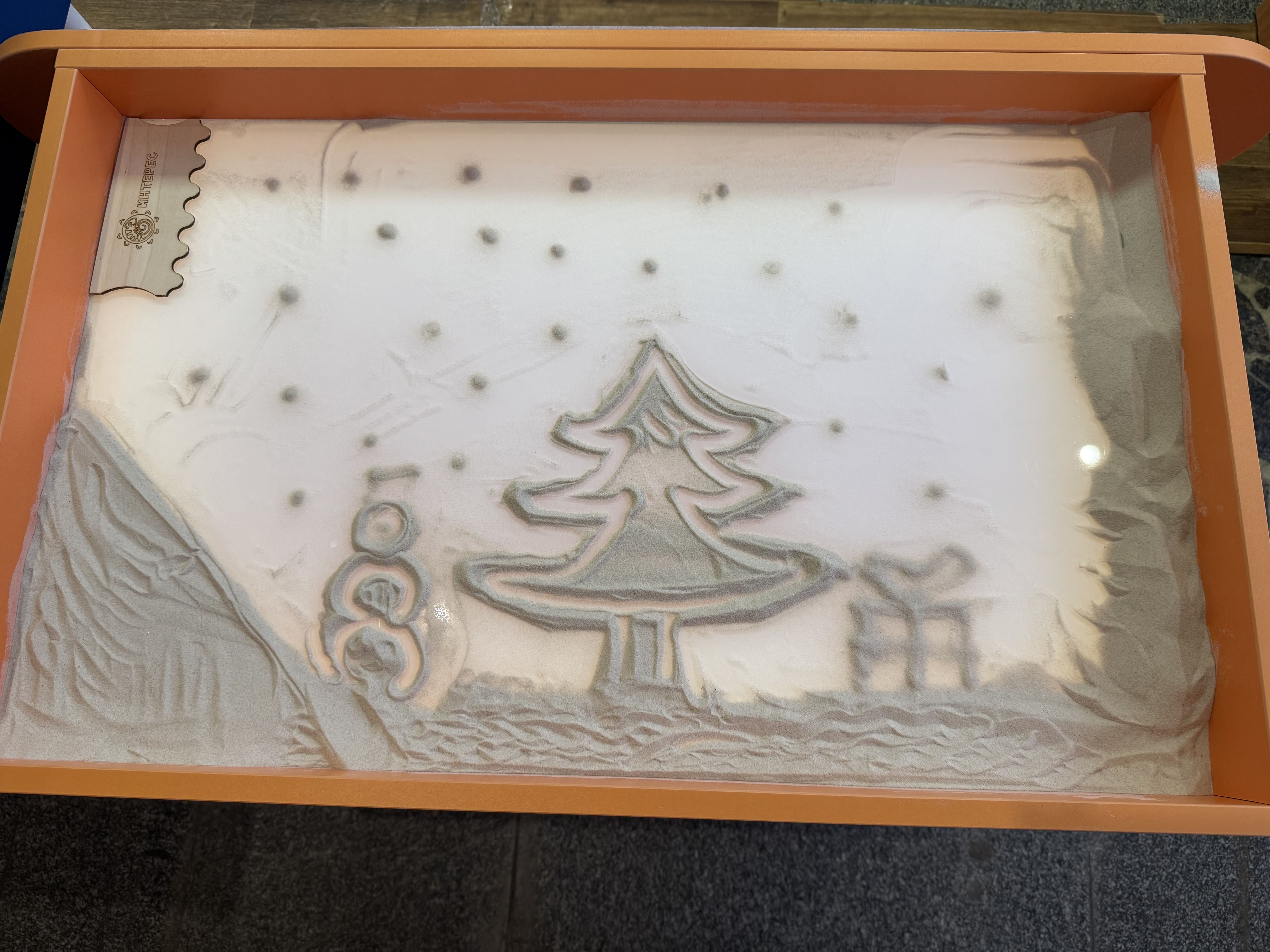 Все мы с нетерпением ждём наступления новогодних праздников, особенно дети. Ведь Новый год – это всегда встреча со сказкой, волшебством, это зимние чудеса и, конечно, долгожданные подарки. На занятии ребята смогли погрузиться в атмосферу сказки и волшебства. Сначала дети услышали сказки русских писателей о зиме, а затем попробовали себя в качестве настоящих волшебников и создали на песочных планшетах уникальные новогодние картины: изобразили зимний заснеженный лес, северное сияние, ёлочку, Деда Мороза и Снегурочку на санках с мешком подарков.
