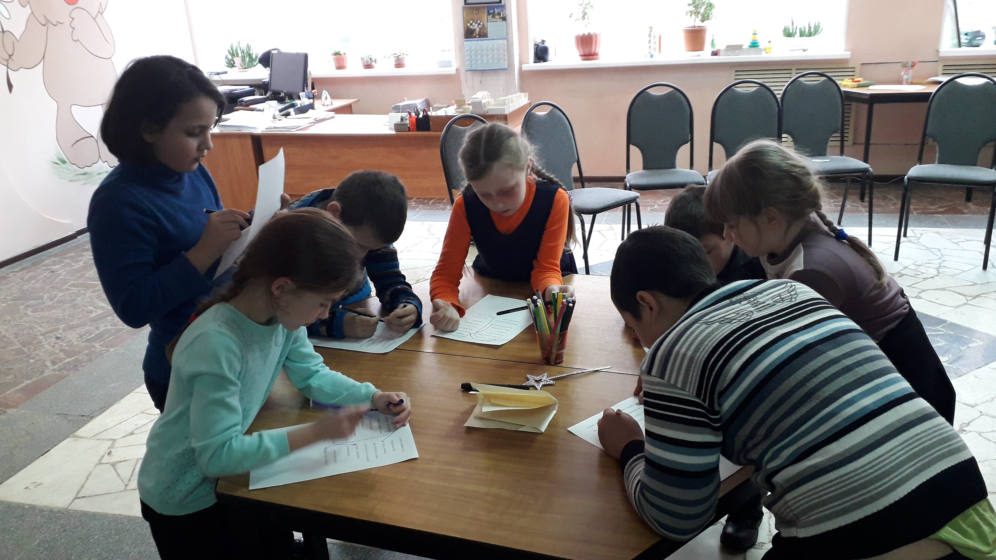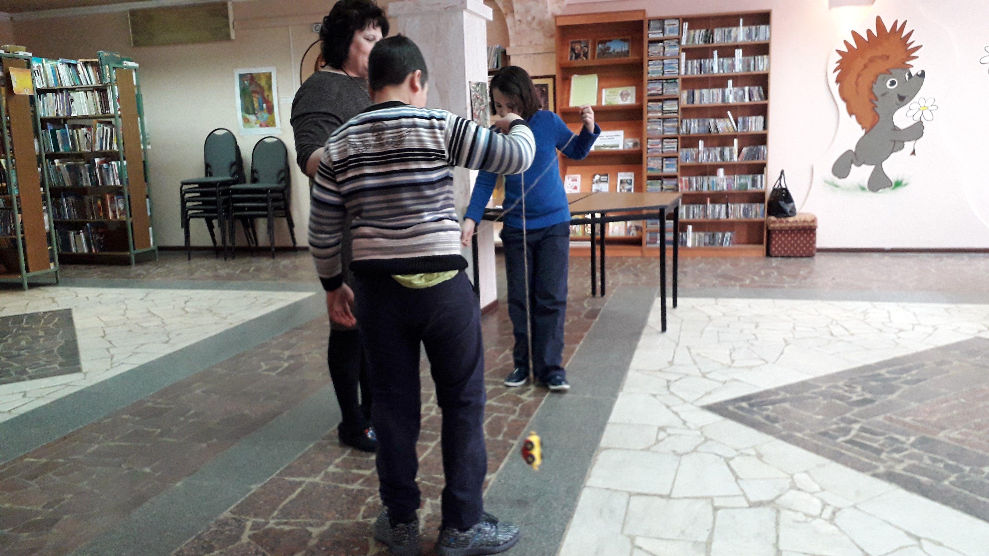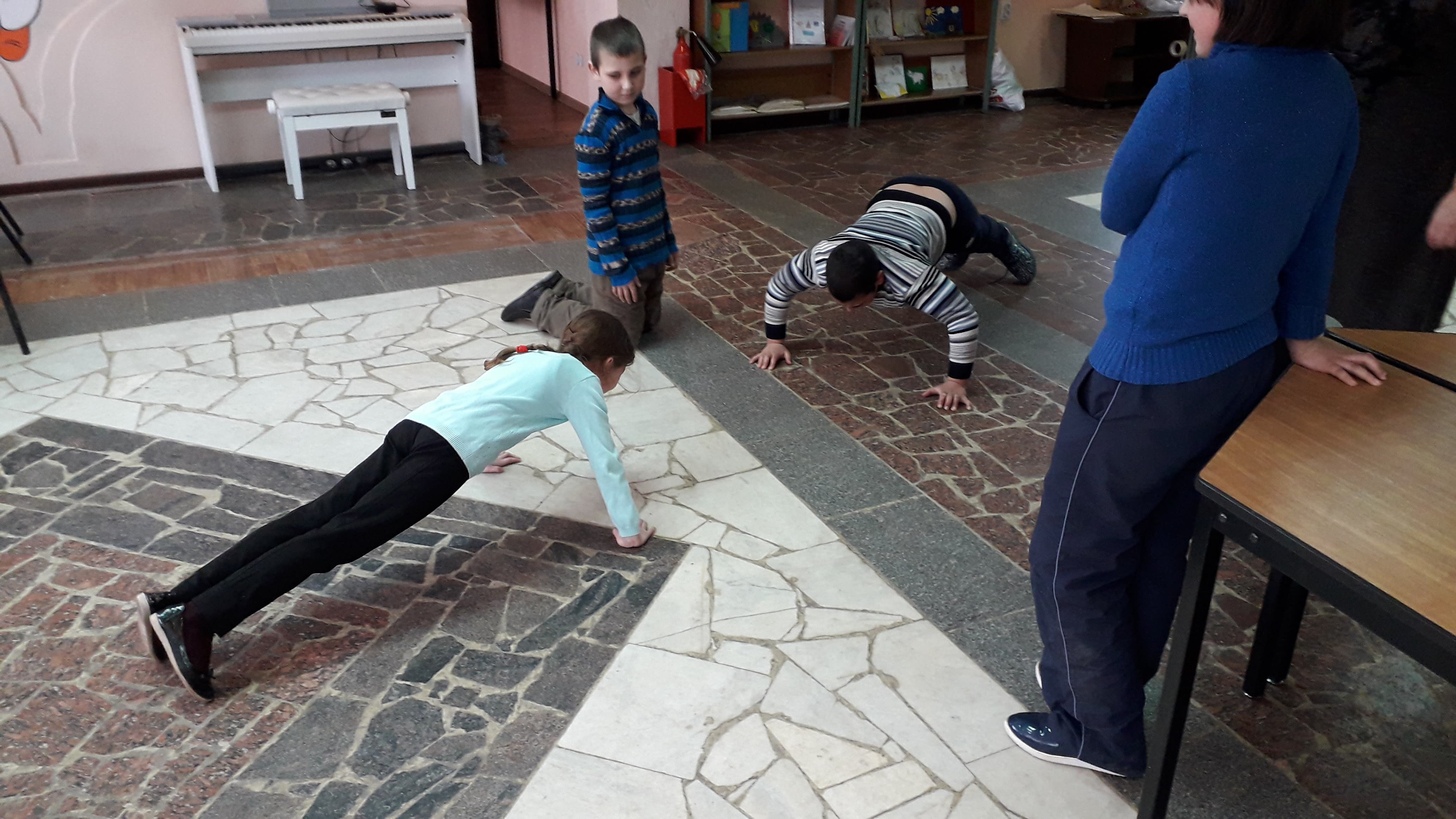 Дети приняли участие в викторине, а затем состязались в ловкости и силе, рисовали с завязанными глазами, бегали между расставленными кеглями, отжимались и т. д. После этого ребята пили чай и общались.