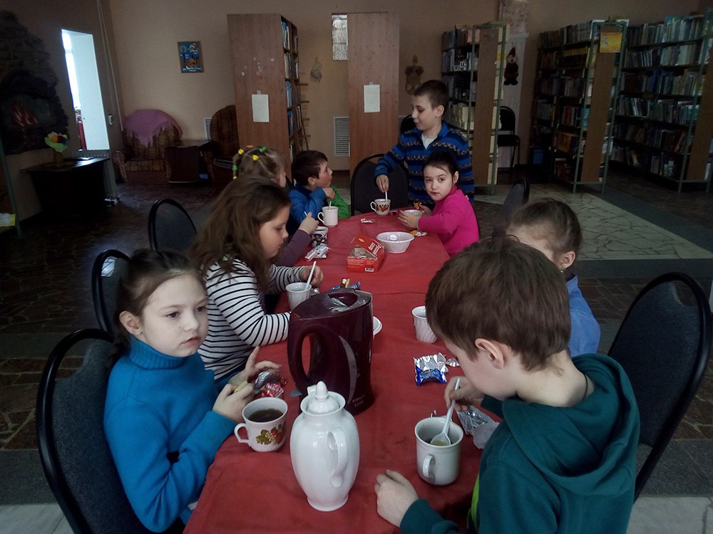 Работники детского отдела побеседовали с ребятами о том, как появляются сказки, какие они бывают (авторские и народные), чему они учат, за что мы любим их и проносим в своём сердце через всю жизнь. Потом дети стали соревноваться в знании сказок: отвечали на вопросы разминки, рисовали колобка с завязанными глазами, находили пары слов (сестрица – Алёнушка, Кощей – бессмертный), угадывали героев сказок по описаниям. Ребята рисовали иллюстрации к своим любимым сказкам. В конце мероприятия дети пили чай и общались в игровой комнате.