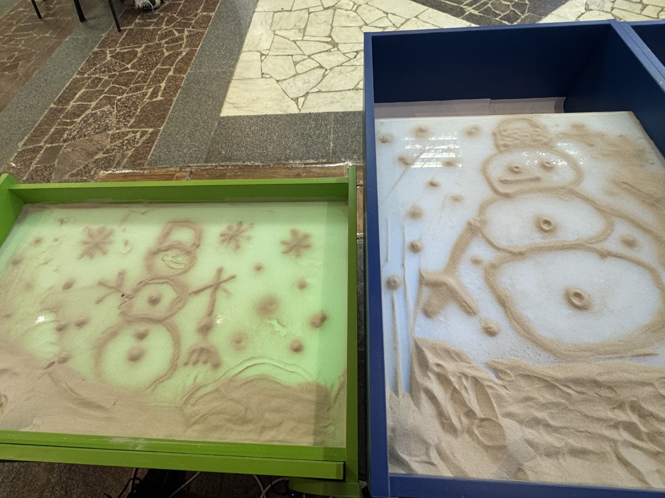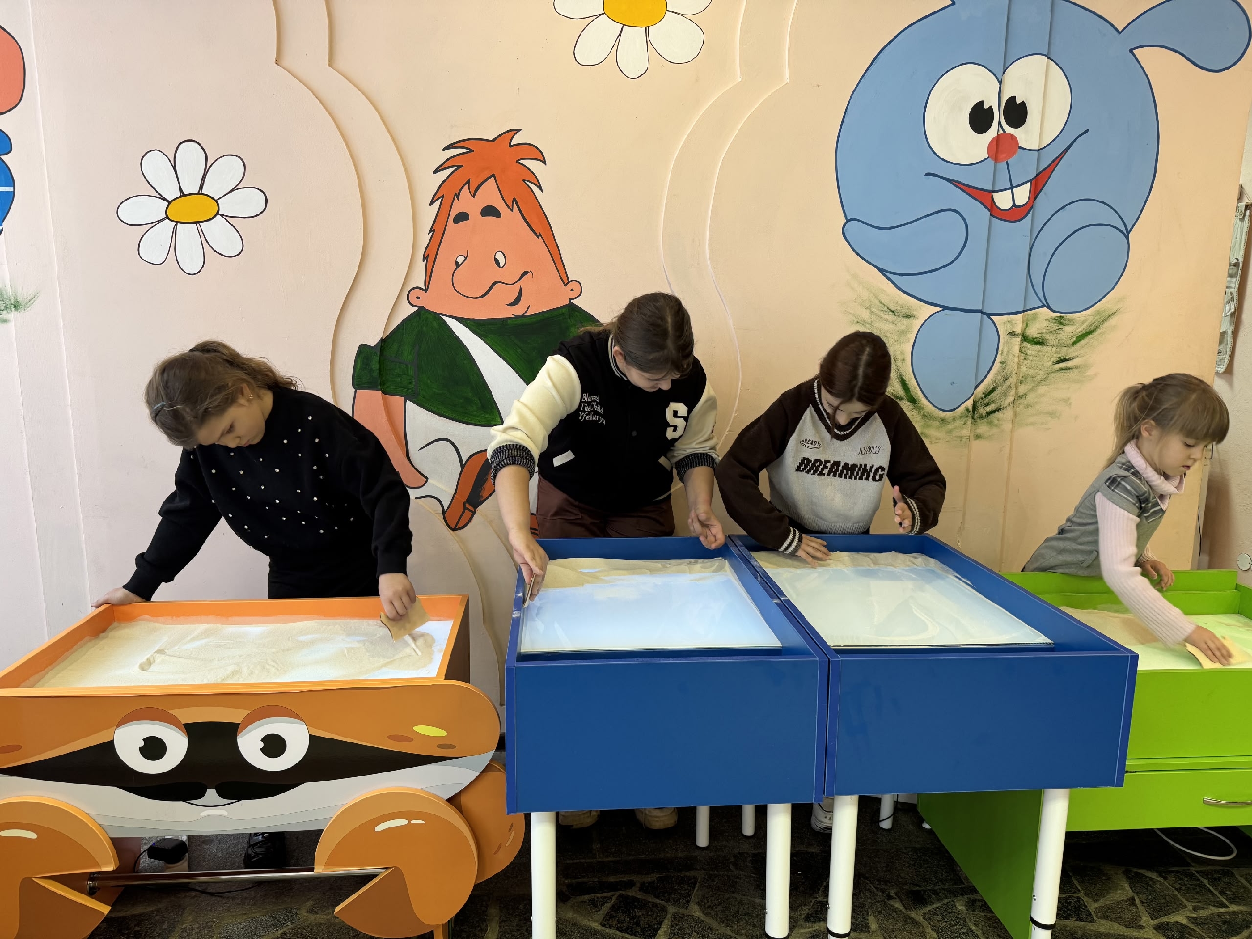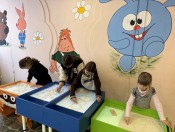 Дети погрузили пальчики в мягкий песок и почувствовали себя настоящими волшебниками. Под руководством педагога они нарисовали на светящихся планшетах симпатичного доброго снеговика в шарфике и с метлой, а над ним – звёзды в ночном небе. Каждый ребёнок придумал и рассказал друзьям свою маленькую зимнюю сказку.