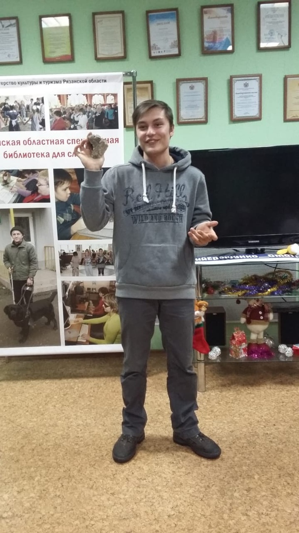 Затем праздничную программу продолжила интереснейшая лекция коллекционера-любителя минералов Дмитрия Сафонова «Волшебный мир камней». Дмитрий познакомил участников праздника с частью своей коллекции, рассказал о месторождениях, истории и магических свойствах представленных камней, среди которых были аметист, аметрин, сапфир, хризопраз, различные виды кварцев и многие другие. Коллекционер подарил библиотеке пирамидку из змеевика, которую сам обработал.