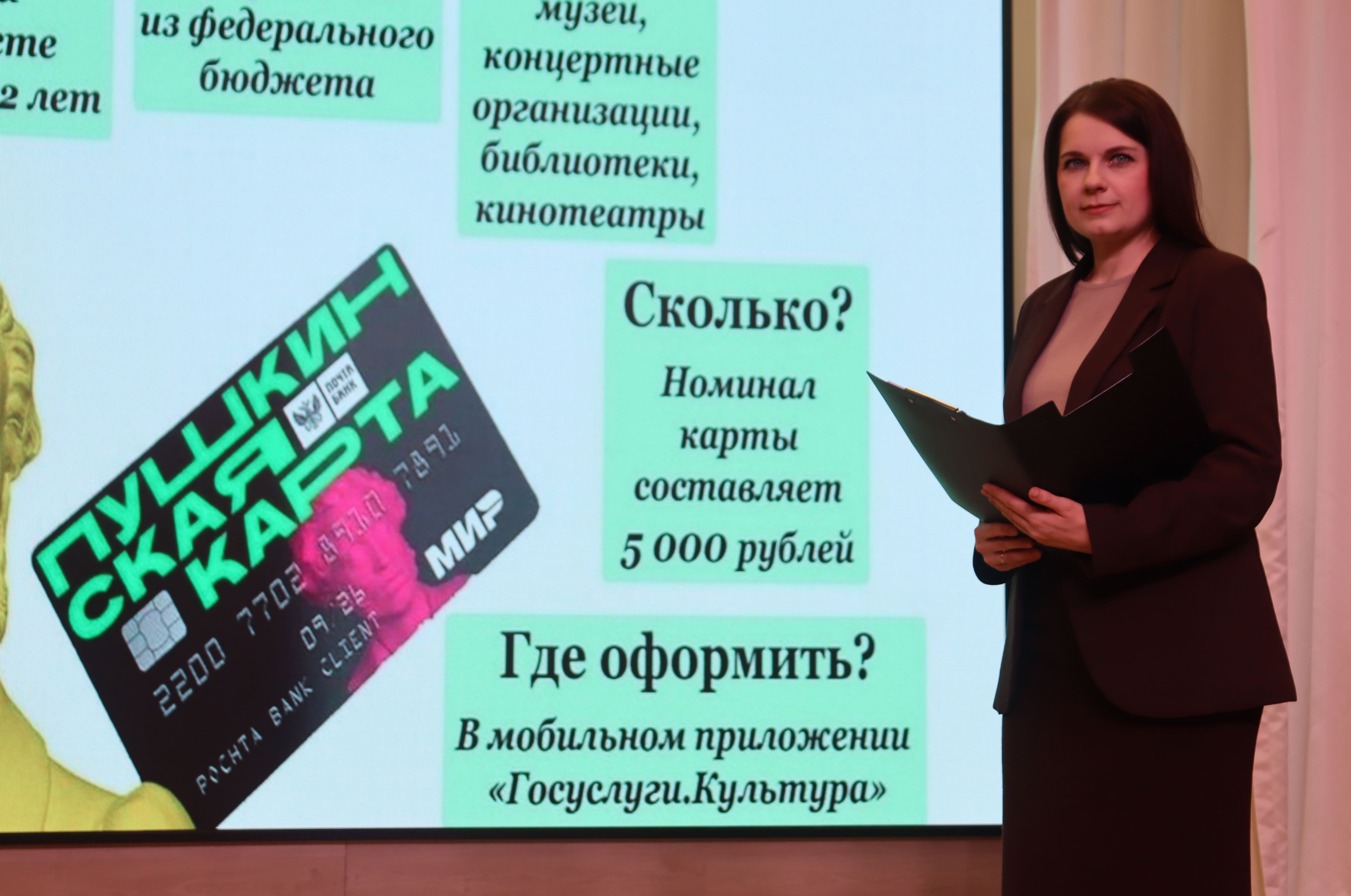 Школьникам и педагогам рассказали о возможностях Пушкинской карты, предназначенной для молодёжи в возрасте от 14 до 22 лет, позволяющей посещать театры, музеи, выставки, кинотеатры и филармонии, участвующие в государственной программе поддержки культуры. Участники получили подробную консультацию о порядке оформления карты, размере выделенных денежных средств, правилах приобретения билетов и мерах защиты от мошенничества. По завершении мероприятия библиотекари провели разъяснительную работу среди педагогов, раздали классным руководителям информационные буклеты и ответили на возникшие вопросы.