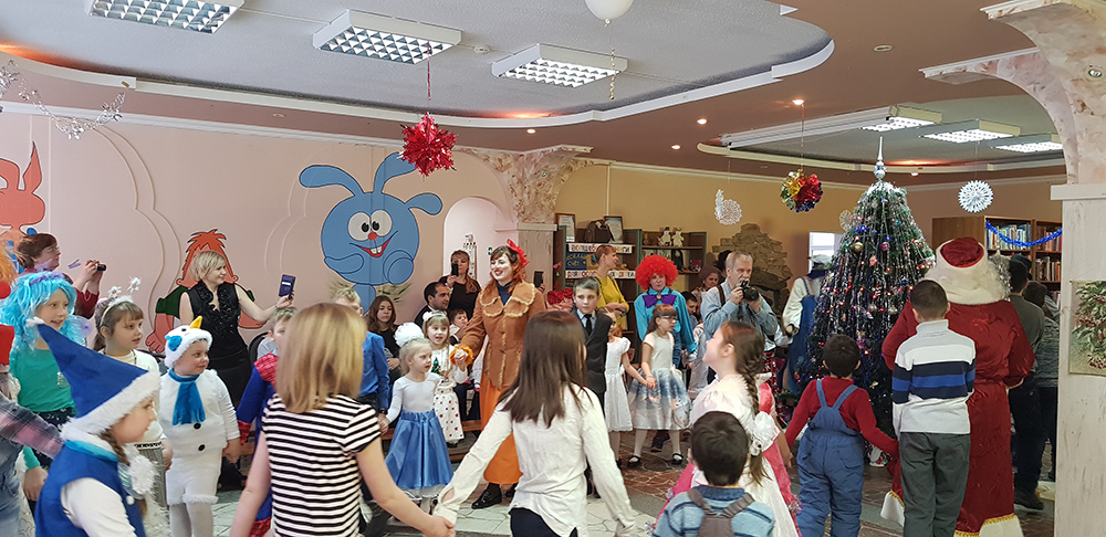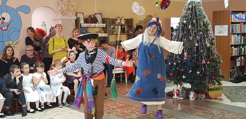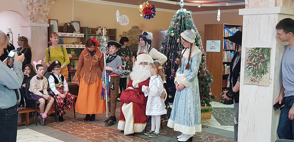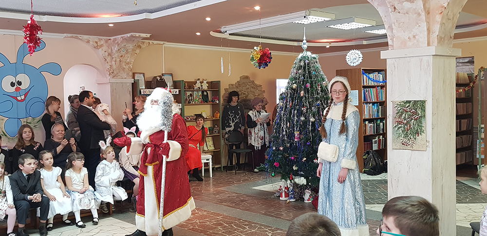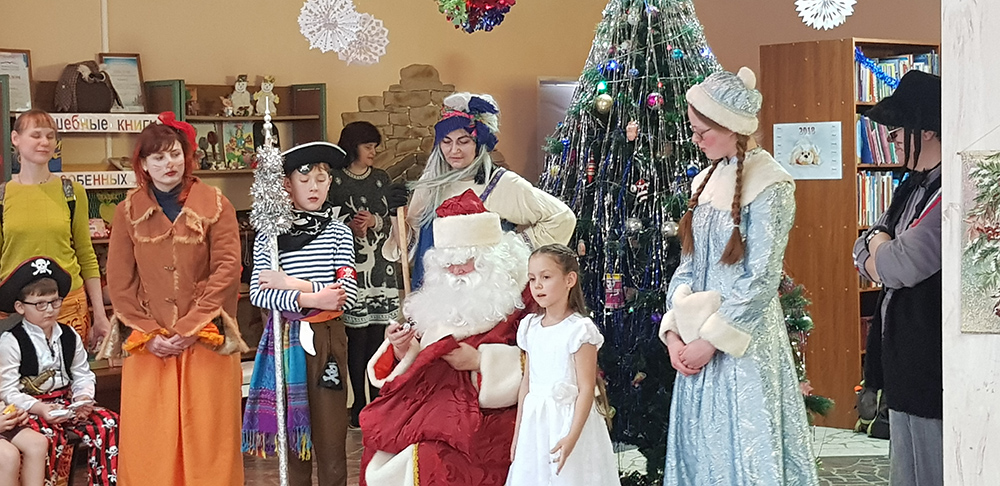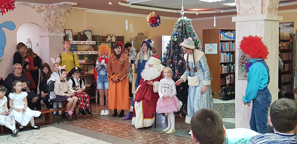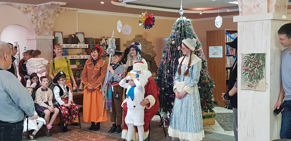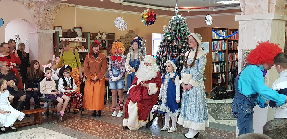 В начале мероприятия наших юных читателей и их родителей поздравила с наступающим праздником директор библиотеки Ольга Александровна Лунёва. Затем наша постоянная читательница Алёна Гриценко показала ребятам свою новую сказку для кукольного театра «По щучьему веленью». А потом Баба-Яга, клоуны, пират, лиса Алиса и кот Базилио увлекли ребят в настоящее сказочное новогоднее приключение. Девчонки и мальчишки преодолели все трудности и дождались Деда Мороза и Снегурочку. Дети водили хороводы, танцевали, угадывали мелодии, бегали в коробках, скакали на шарах, а потом устроили домашний концерт из заранее выученных стихов и песен. Затем на празднике появился символ наступающего года – весёлый поросёнок, сказочные герои поздравили ребят с Новым годом и вручили подарки.