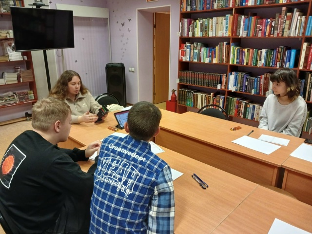 В читальном зале царила атмосфера напряжения и сосредоточенности, школьники активно обсуждали версии, стремясь к победе.