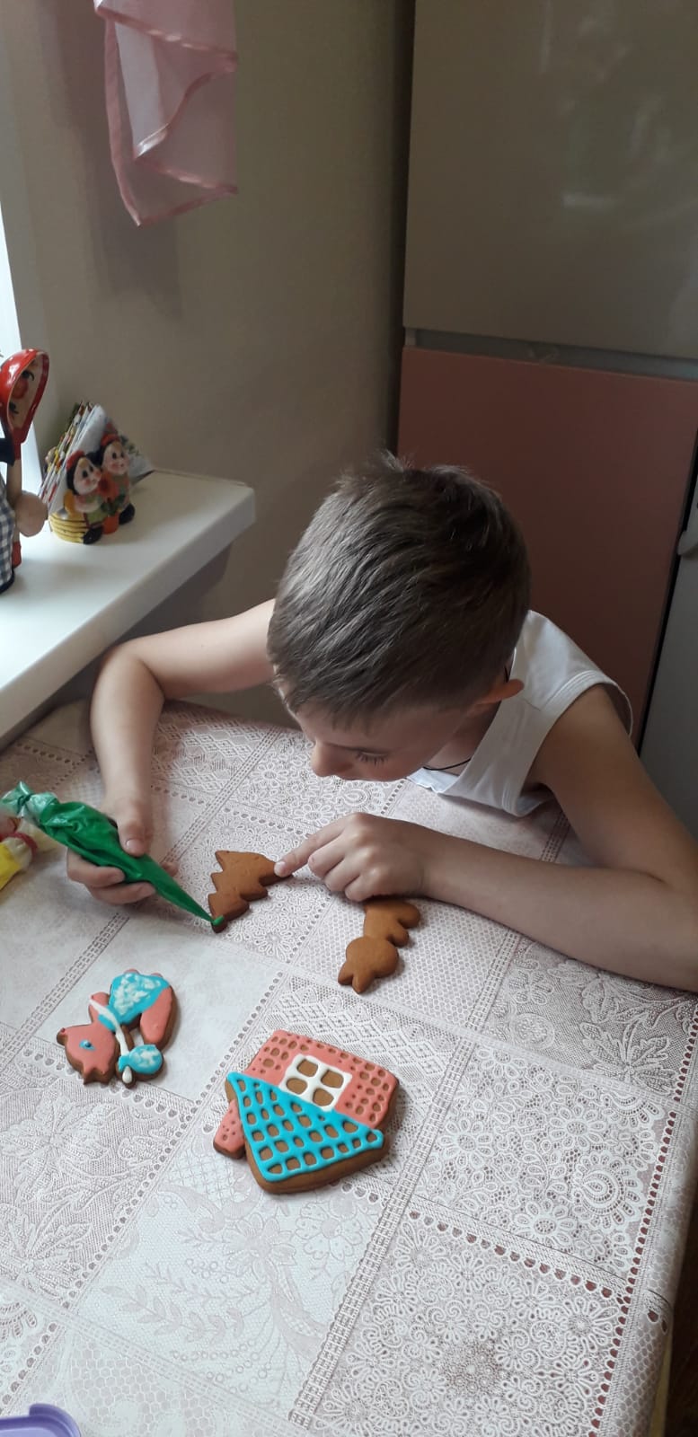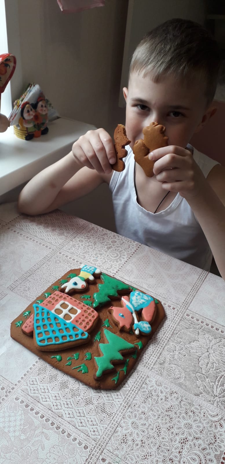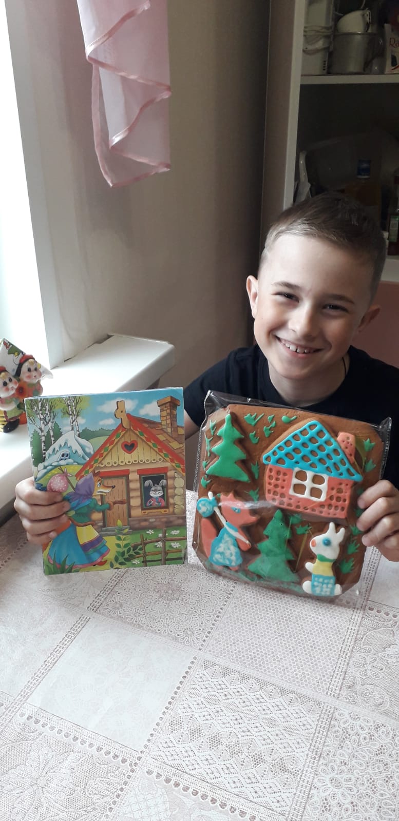 Максим учится в первом классе. Сказка «Заюшкина избушка» была одной из первых прочитанных им сказок. Книга с интересными красочными рисунками внуку очень понравилась. Я предложила Максиму вместе с ним испечь имбирные пряники в виде героев этой сказки и раскрасить их глазурью.