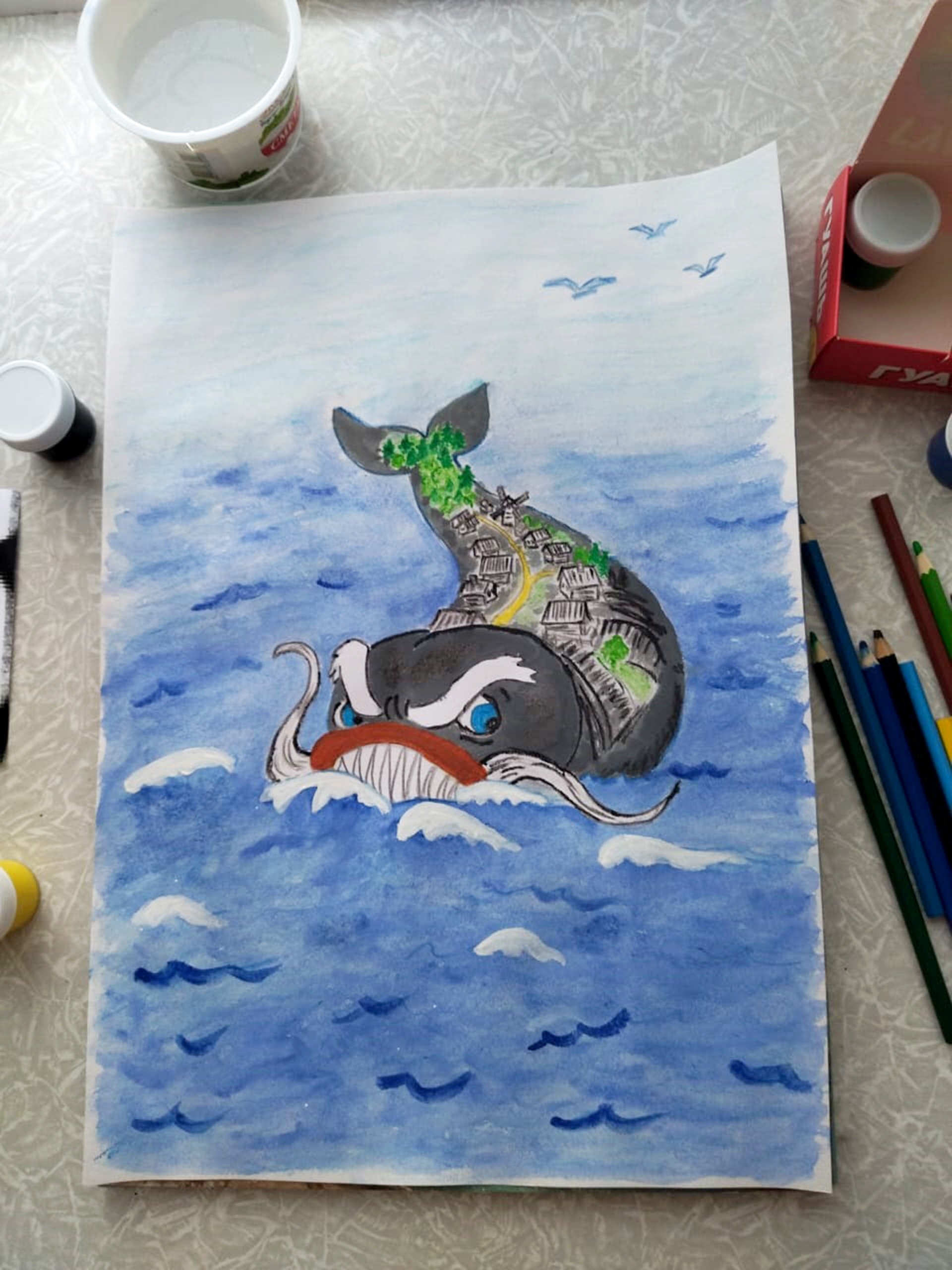 Постепенно кит обретал форму, обрастая деталями, созданными воображением художницы. Так на бумаге появился сказочный персонаж Чудо-юдо рыба-кит с многовековой мудростью и грустью в глазах.