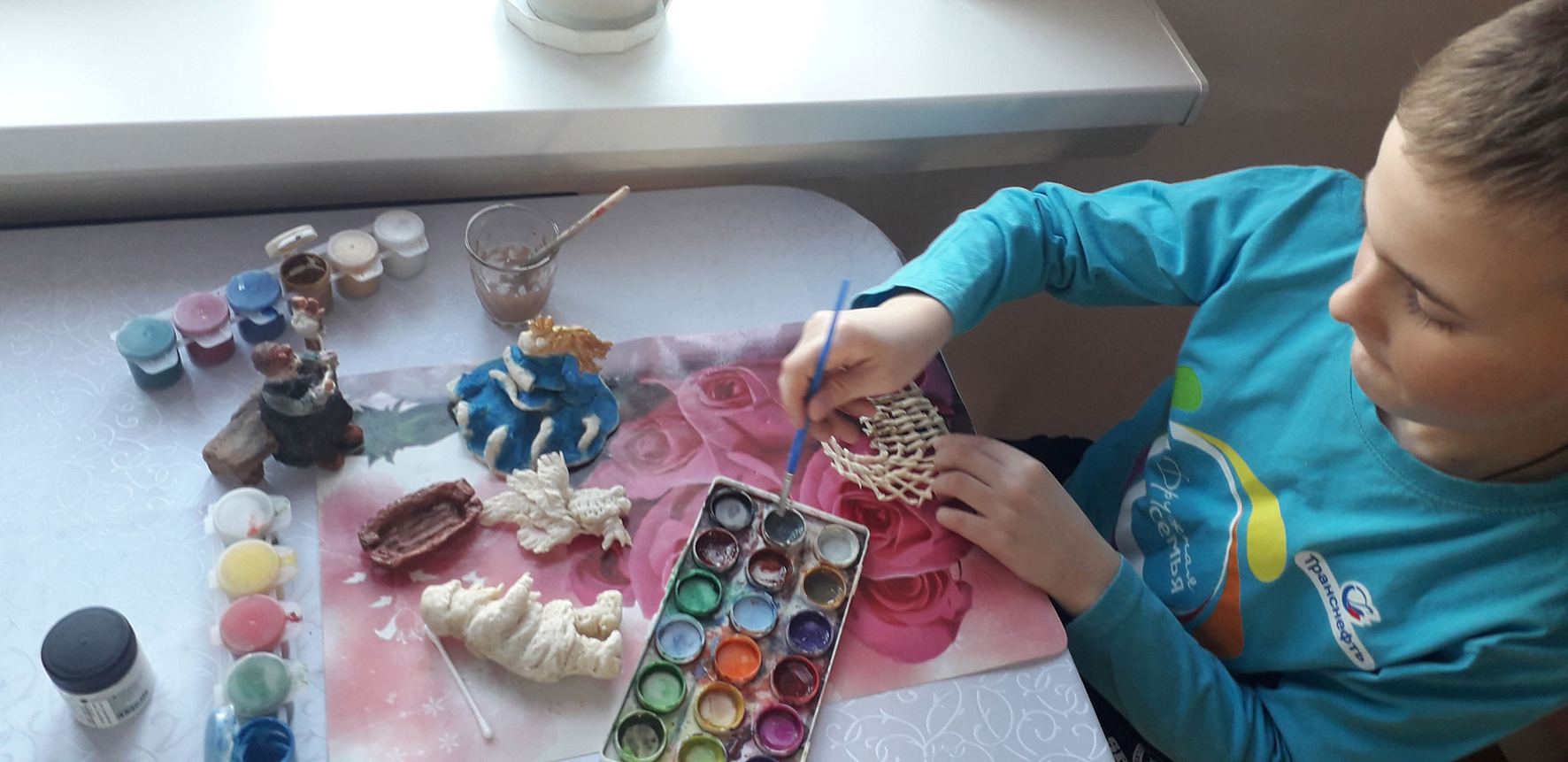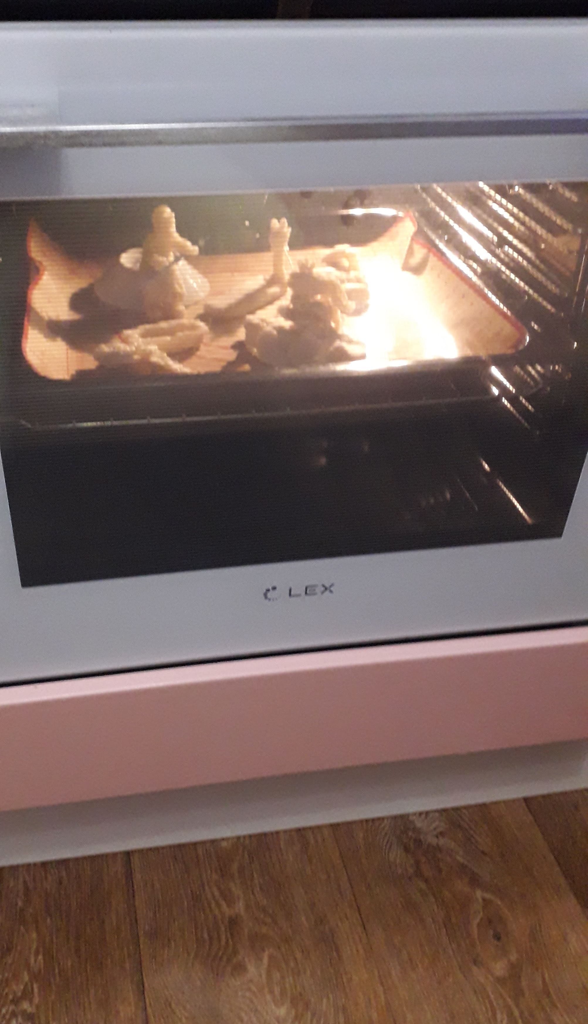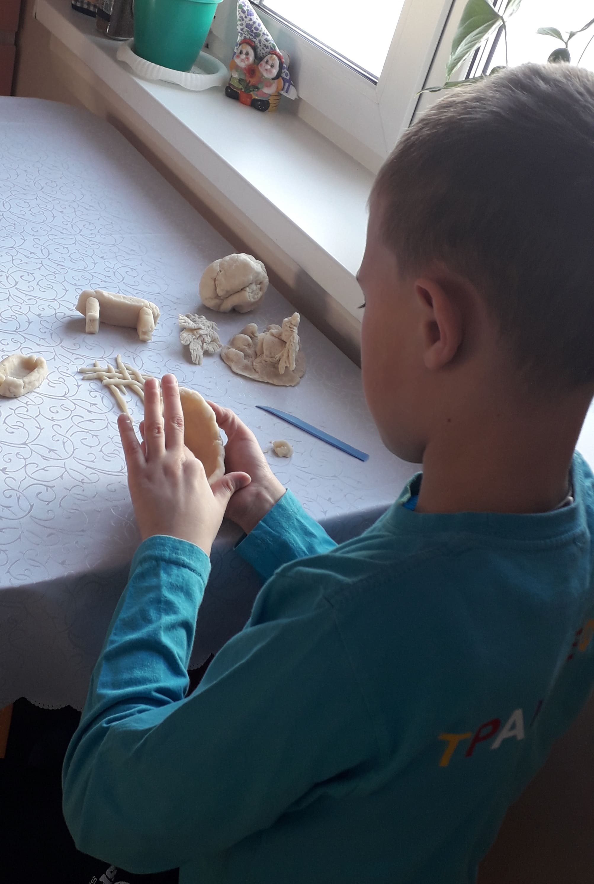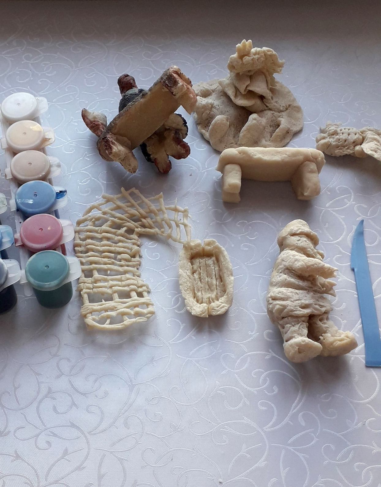 И снова из теста, но на этот раз из соленого, невкусного и совсем несъедобного. Вылепили фигурки, просушили их в духовке, а затем раскрасили акварельными красками. Вот что получилось в результате.