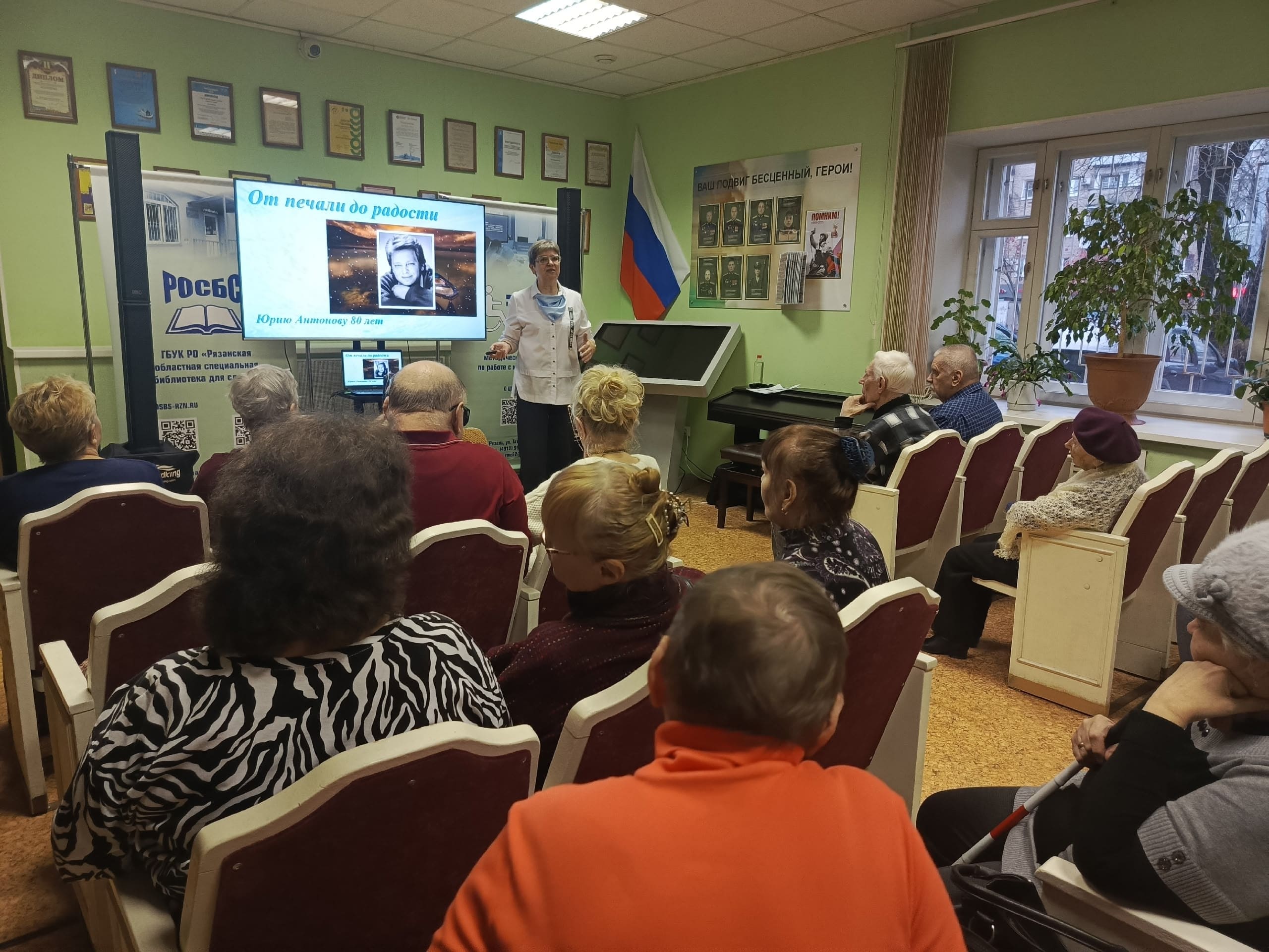«От печали до радости», «Анастасия», «Золотая лестница» и многие другие всеми любимые песни Юрия Антонова прозвучали в программе вечера-портрета, который прошёл в Комплексном центре обслуживания населения г. Рязани, территориальном отделении № 3 ВОИ г. Рязани и завершился 18 ноября 2025 года в библиотеке. Событие было приурочено к 80-летнему юбилею известного композитора и исполнителя.