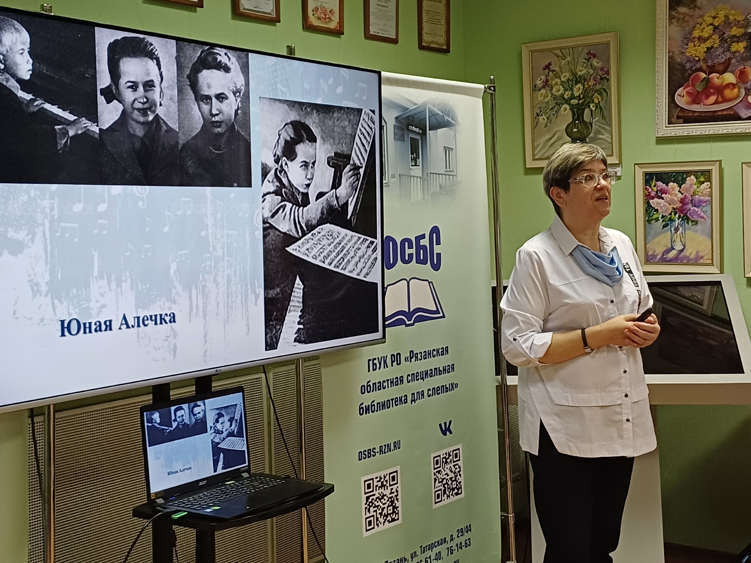 Главный библиотекарь Регионального методического центра по работе с инвалидами Смирнова О.А. рассказала о детстве и юности талантливой Алечки, её первых песенных работах, композиторском развитии и совершенствовании.