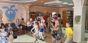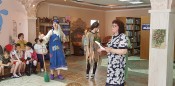 После спектакля под волшебную музыку в зал вышла Сказочница и предложила детям вместе построить Музей сказок. Но для того, чтобы его построить, необходимо было преодолеть препятствия: сказочные герои в исполнении сотрудников библиотеки и юных читателей – Пакости, Кот в сапогах, Леший, Водяной, Баба Яга, Золушка, и Буратино – придумали для детей конкурсы, загадки, викторины, игры.